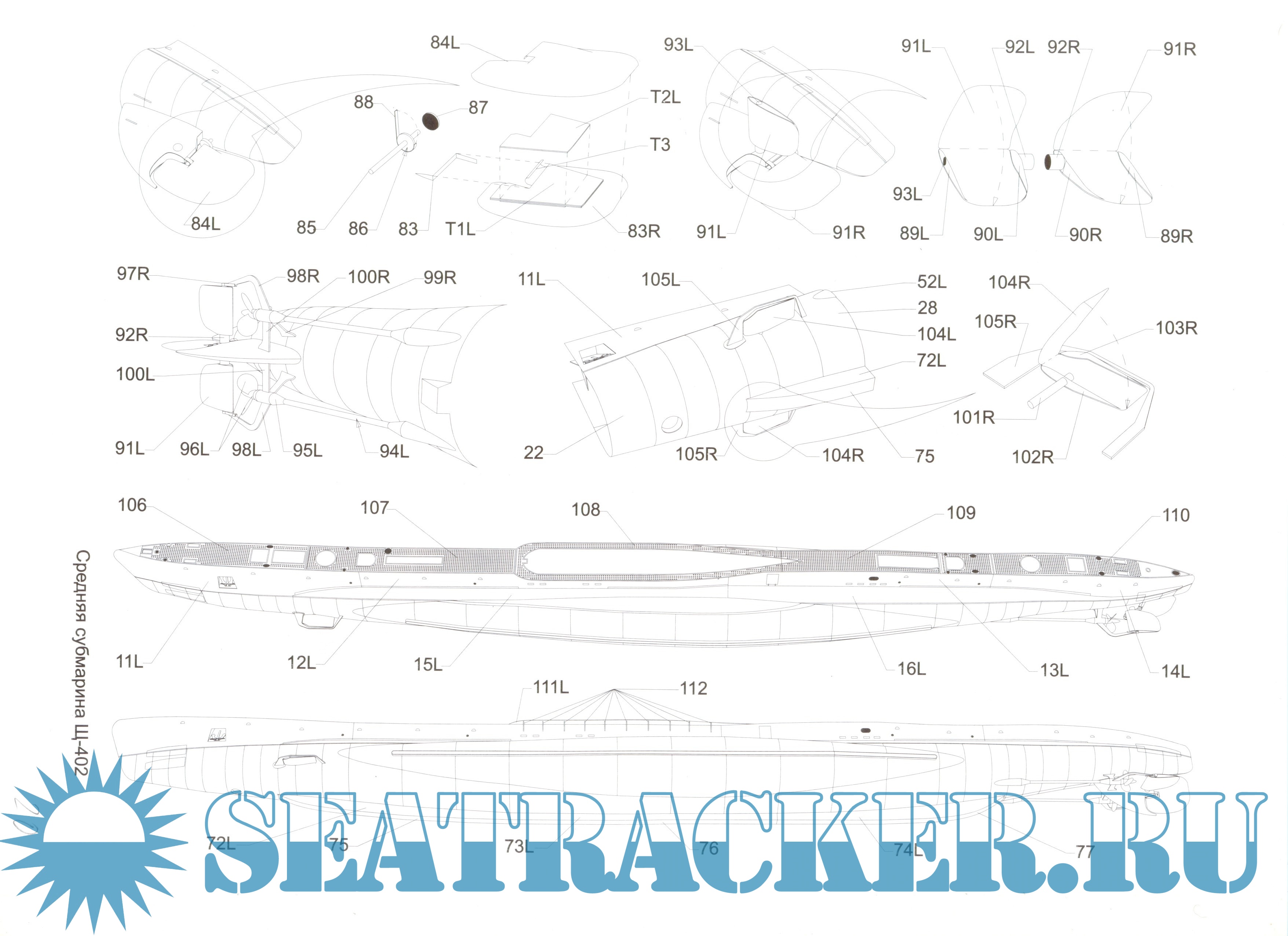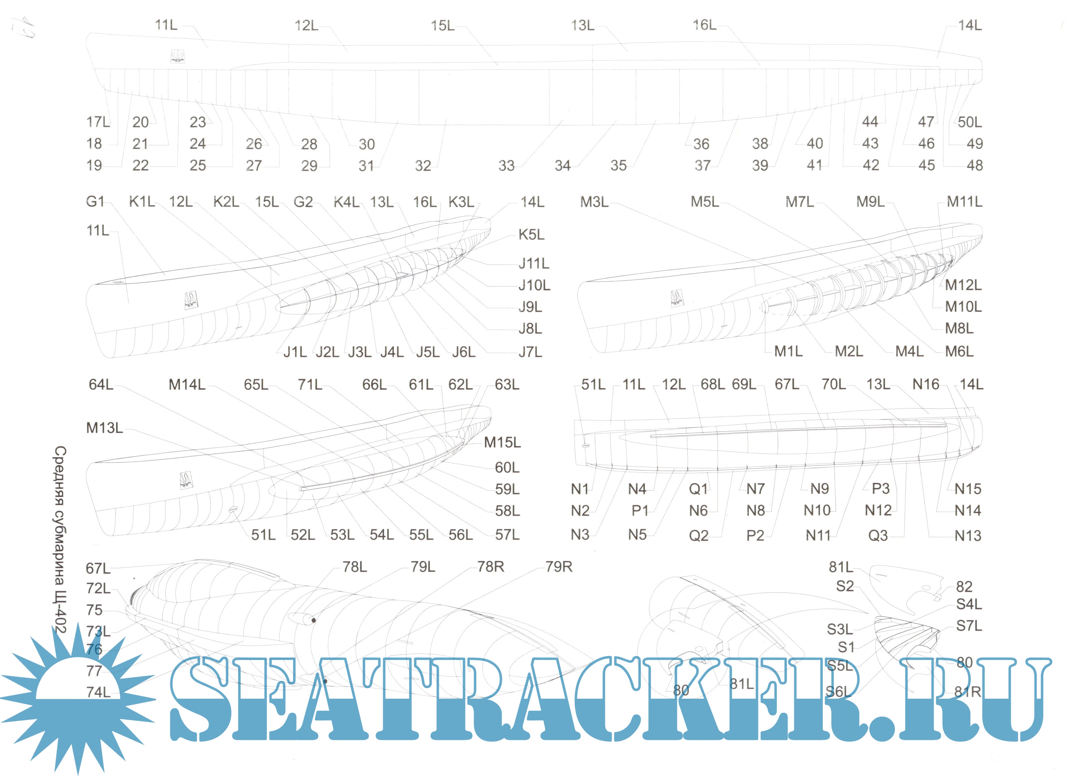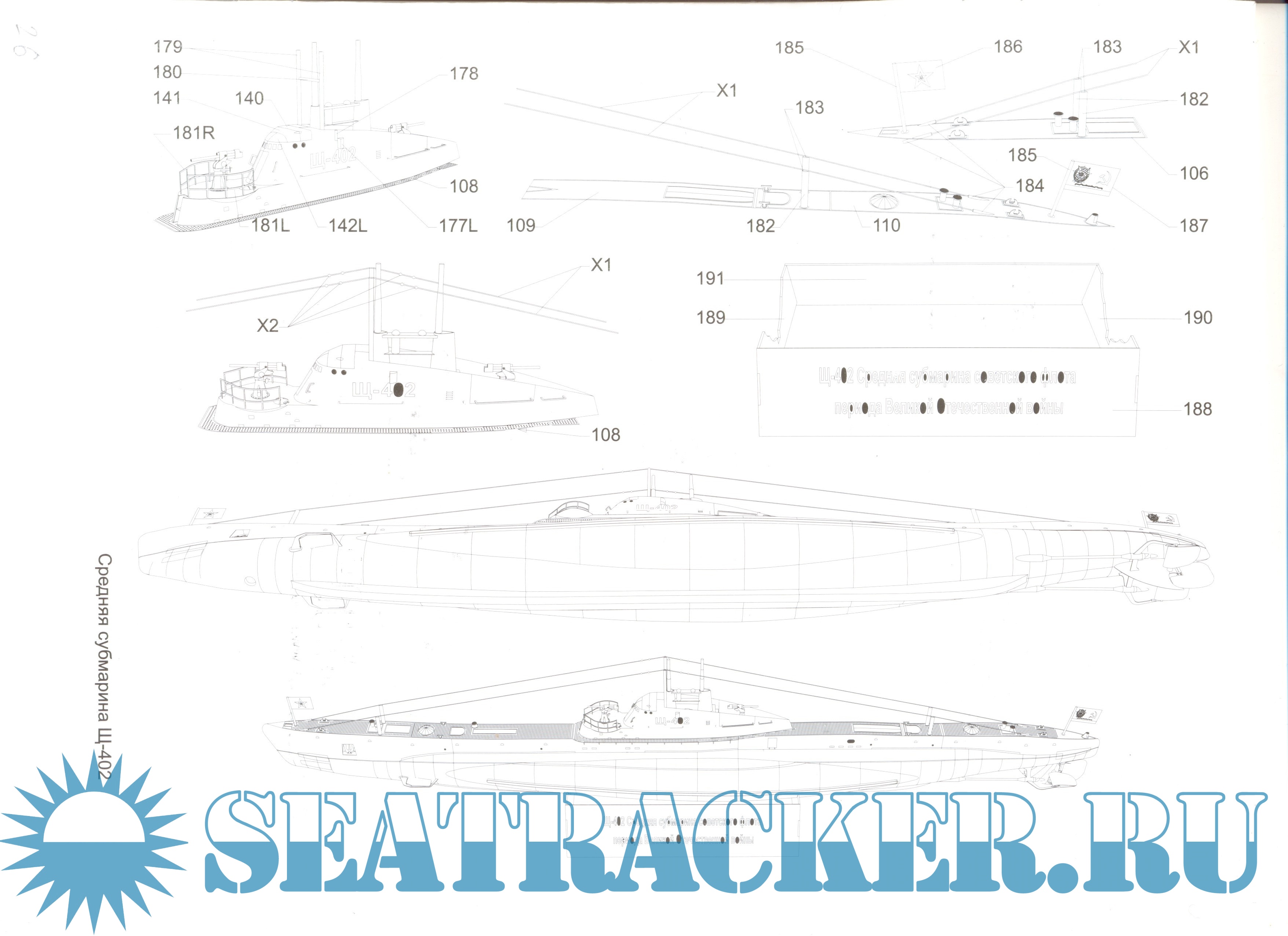 Описание: 31 лист цветных выкроек и инструкций для изготовления бумажной модели подводной лодки Щ-402 1936 год в масштабе 1:100