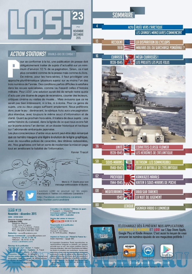 Year: 2015 Language: French Author: Collective Genre: Periodical publication Edition: 2015 11-12 Format: PDF Quality: eBook Pages count: 84 Description: LES ÉDITIONS CARAKTÈRE PRENNENT LE LARGE EN LANÇANT UN NOUVEAU MAGAZINE CONSACRÉ À LA GUERRE NAVALE !Les sujets passionnants ne manquent pas et LOS ! met un point d’honneur à les présenter au lecteur comme cela n’a jamais été fait dans la presse française jusqu’à présent. Un seul mot d’ordre pour l’équipe rédactionnelle : rigueur scientifique et présentation ludique !S’appuyant sur un fond photographique d’exception, sur des plans de bateaux et d’avions, les éditions Caraktère innovent une fois de plus en vous proposant aussi des vues 3D détaillées, le tout au service de textes soigneusement rédigés par des auteurs spécialisés. Vous comprendrez ainsi comment fonctionne un submersible, comment se déroule un combat naval, comment est conçu un cuirassé ou comment attaquent les avions-torpilleurs !Revivez au fil des pages l’aventure humaine exceptionnelle des matelots de la marine marchande affrontant les U-Boote en Arctique, ou celle des pilotes embarqués sur les porte-avions américains et japonais. Lisez les exploits des hommes-grenouilles italiens en Méditerranée, des équipages des vedettes lance-torpilles dans la Manche, des sous-marins soviétiques de la guerre froide ou des grands cuirassés de 1914-18
