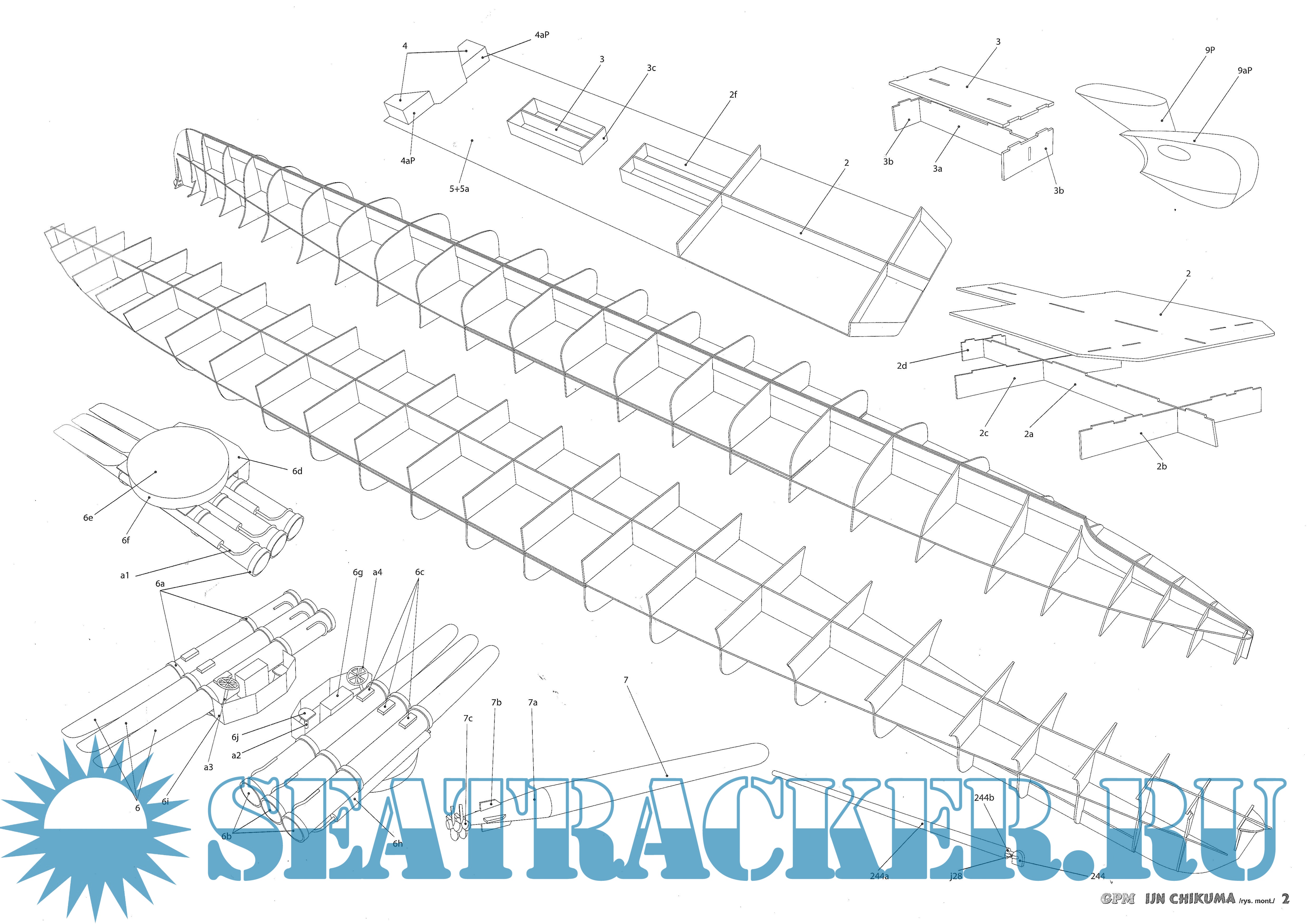 42 листа цветных выкроек и инструкций для изготовления бумажной модели японского крейсера IJN Chikuma в масштабе 1:200