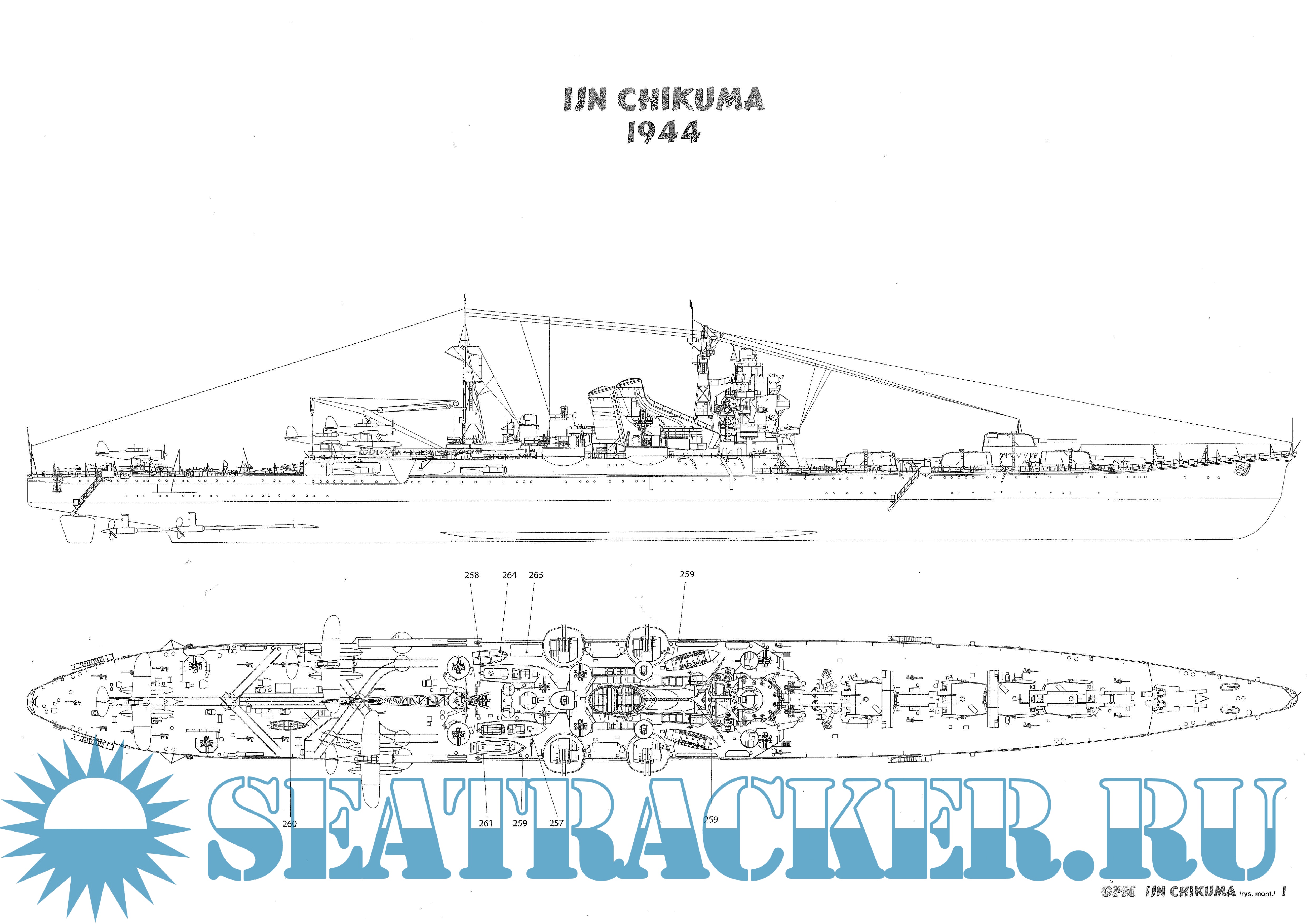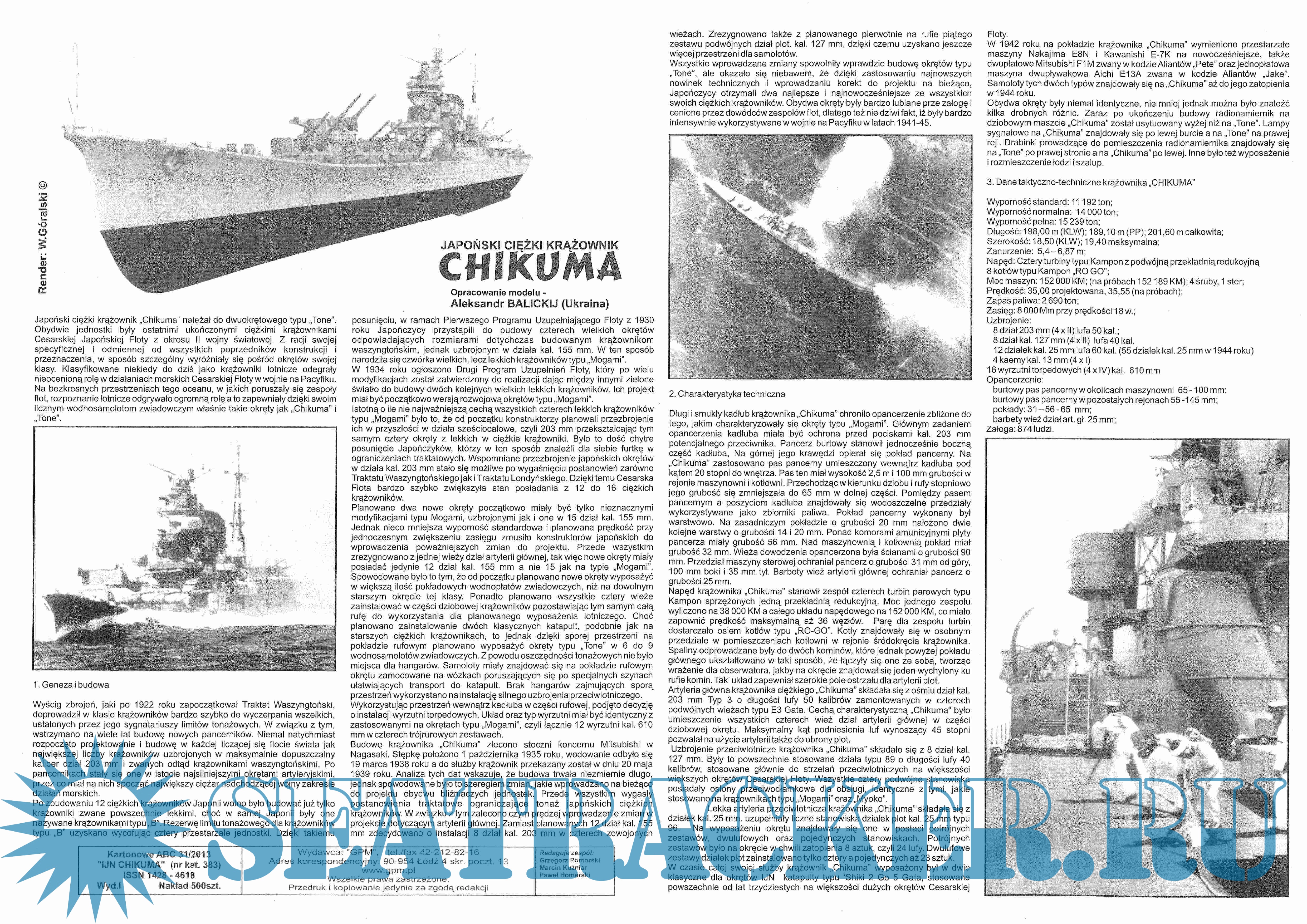 Описание: 42 листа цветных выкроек и инструкций для изготовления бумажной модели японского крейсера IJN Chikuma в масштабе 1:200