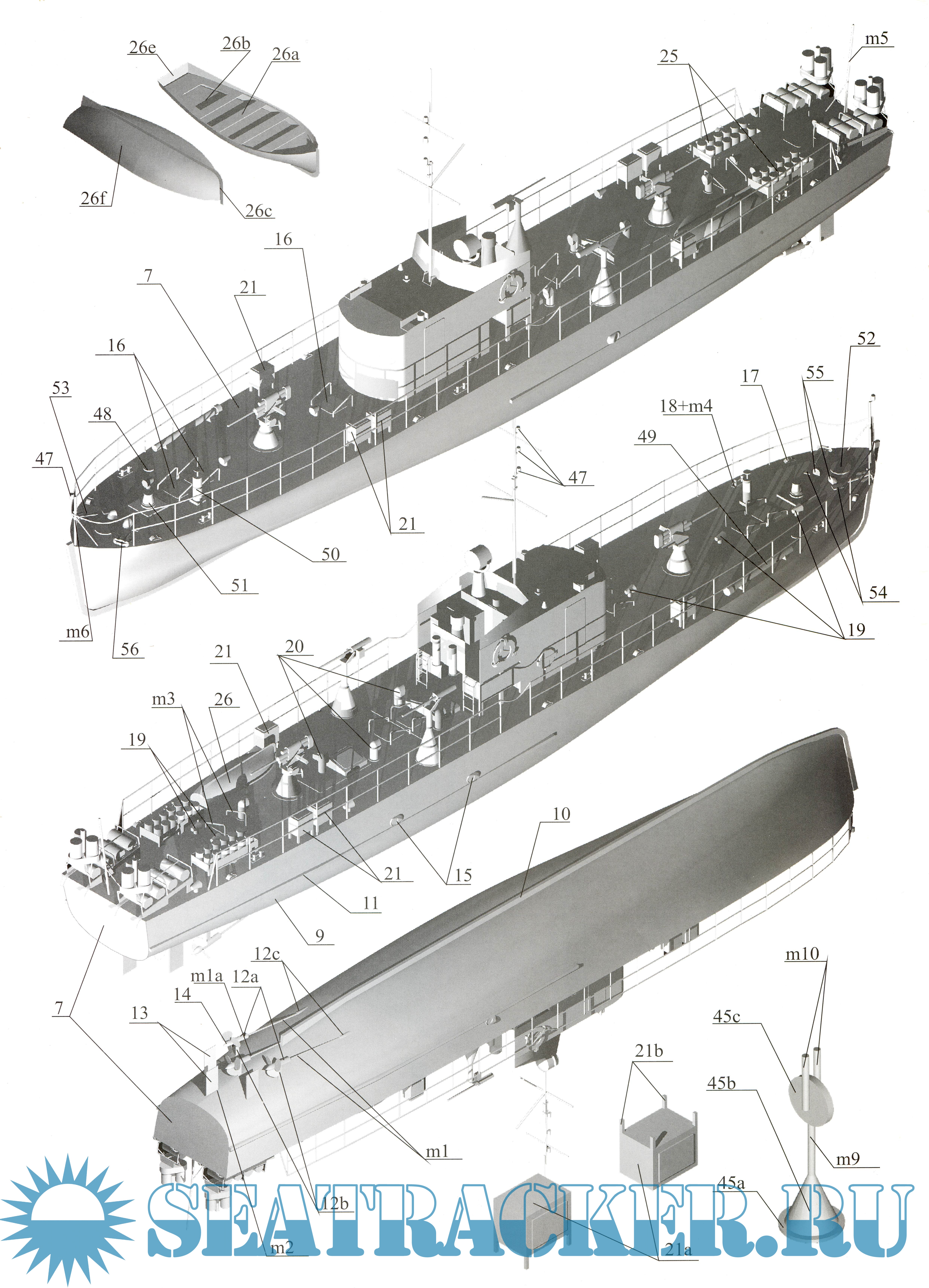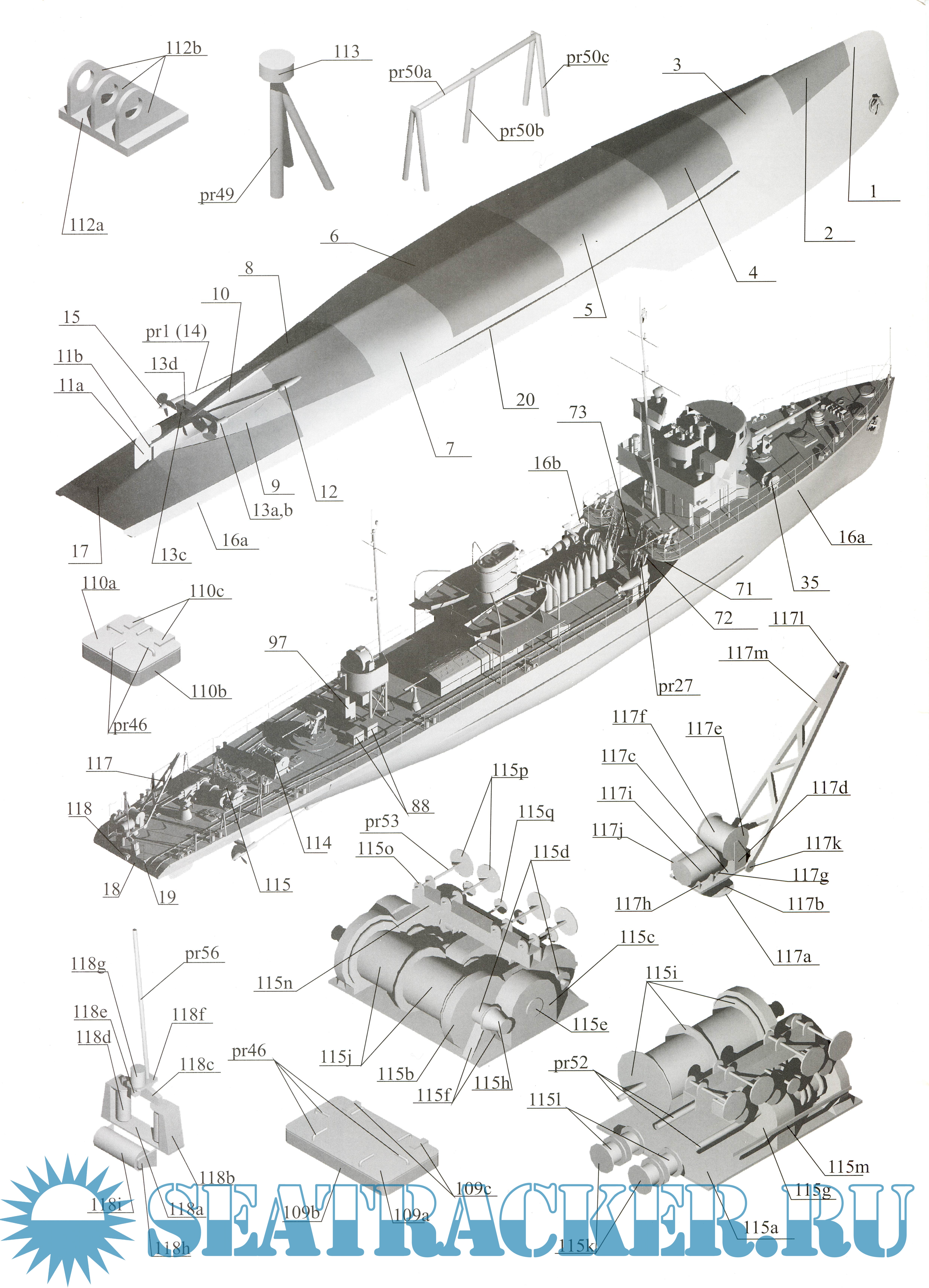 Описание: 16 лисов цветных выкроек и инструкций для изготовления бумажной модели морского охотника МО-4 1942 год в масштабе 1:100