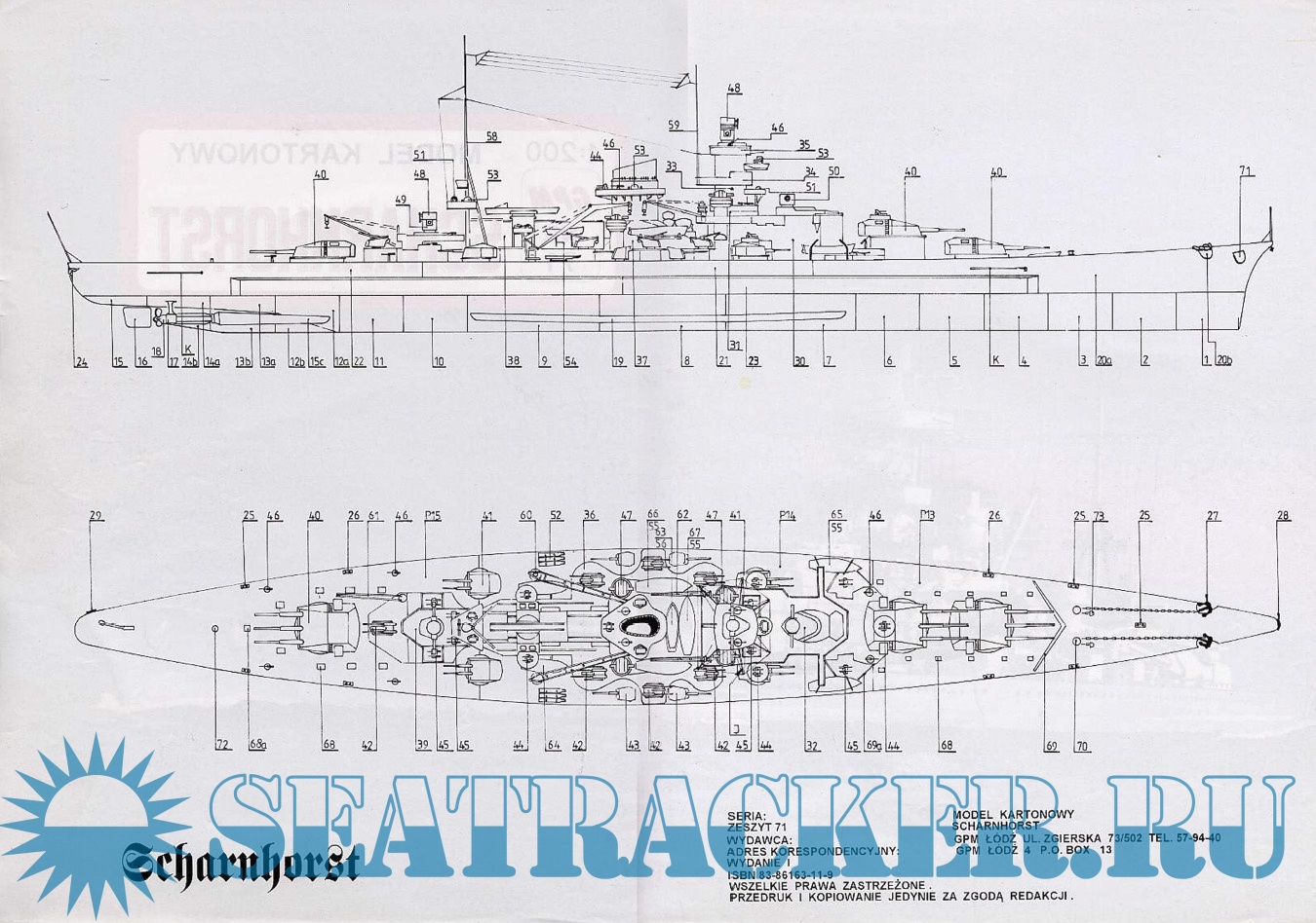 18 листов цветных выкроек и инструкций для изготовления бумажной модели немецкого крейсера Scharnhorst в масштабе 1:200