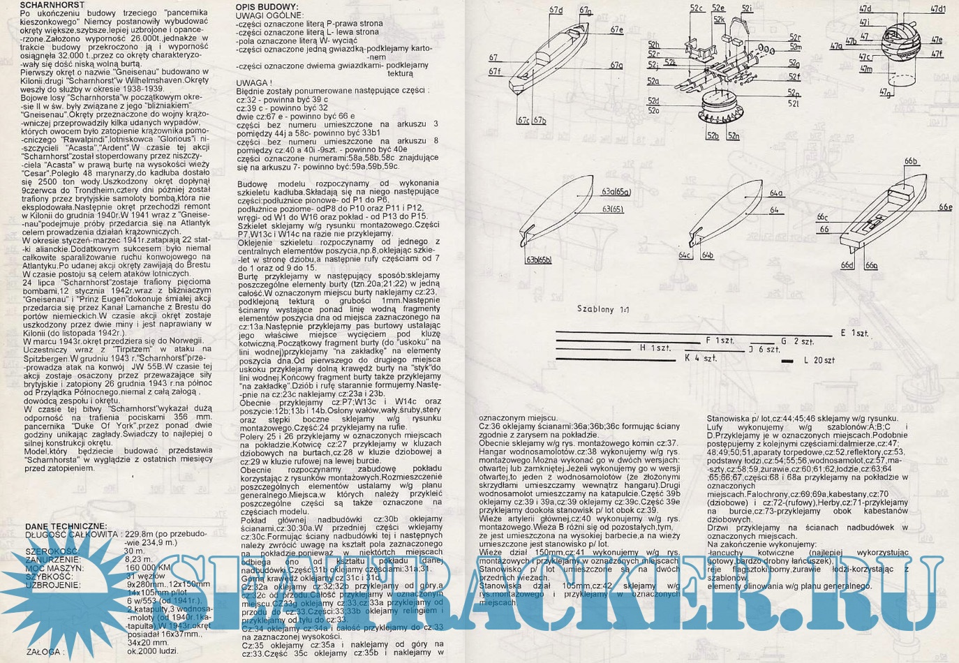 Описание: 18 листов цветных выкроек и инструкций для изготовления бумажной модели немецкого крейсера Scharnhorst в масштабе 1:200