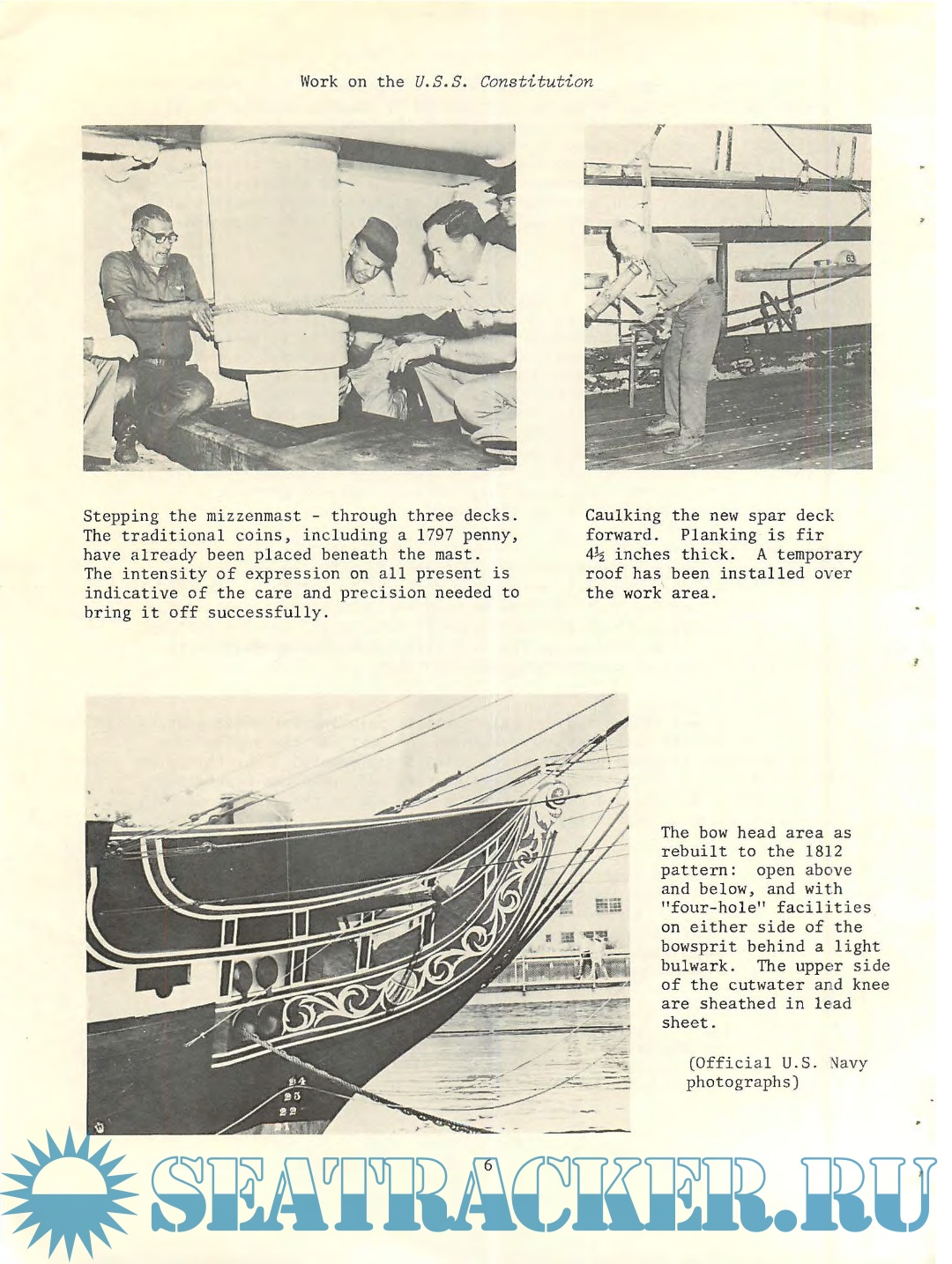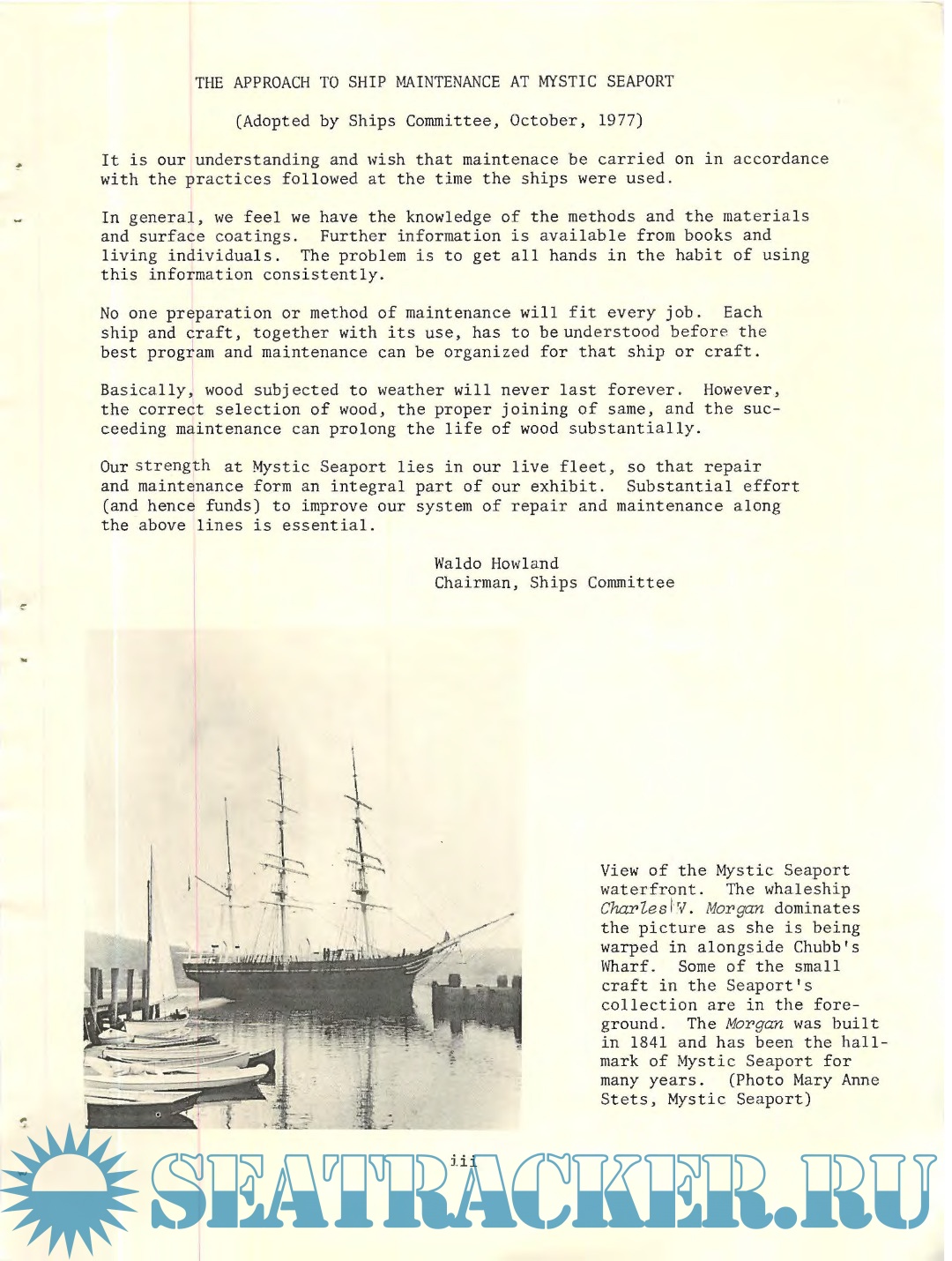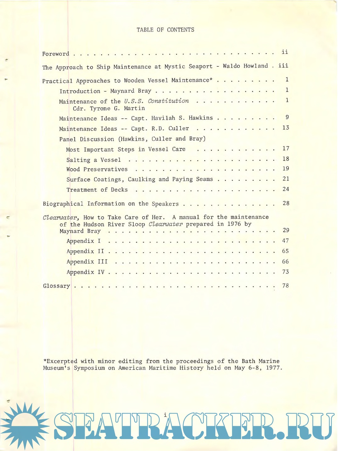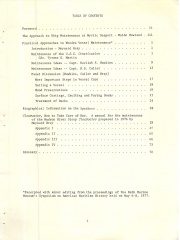 Two papers and discussions are presented on the care of old and relatively new wooden ships. The first was taken with some editing from the proceedings of the Bath Marine Museum's Symposium on American Maritime History, held on May 6-8, 1977, and mainly concerns the maintenance of the U.S.S. Constitution. The second paper is a manual for the maintenance of the Hudson River Sloop Clearwater prepared in 1976 by Maynard Bray. Special care of wooden ships is a skill now limited to a few and efforts are being made to perpetuate these skills.