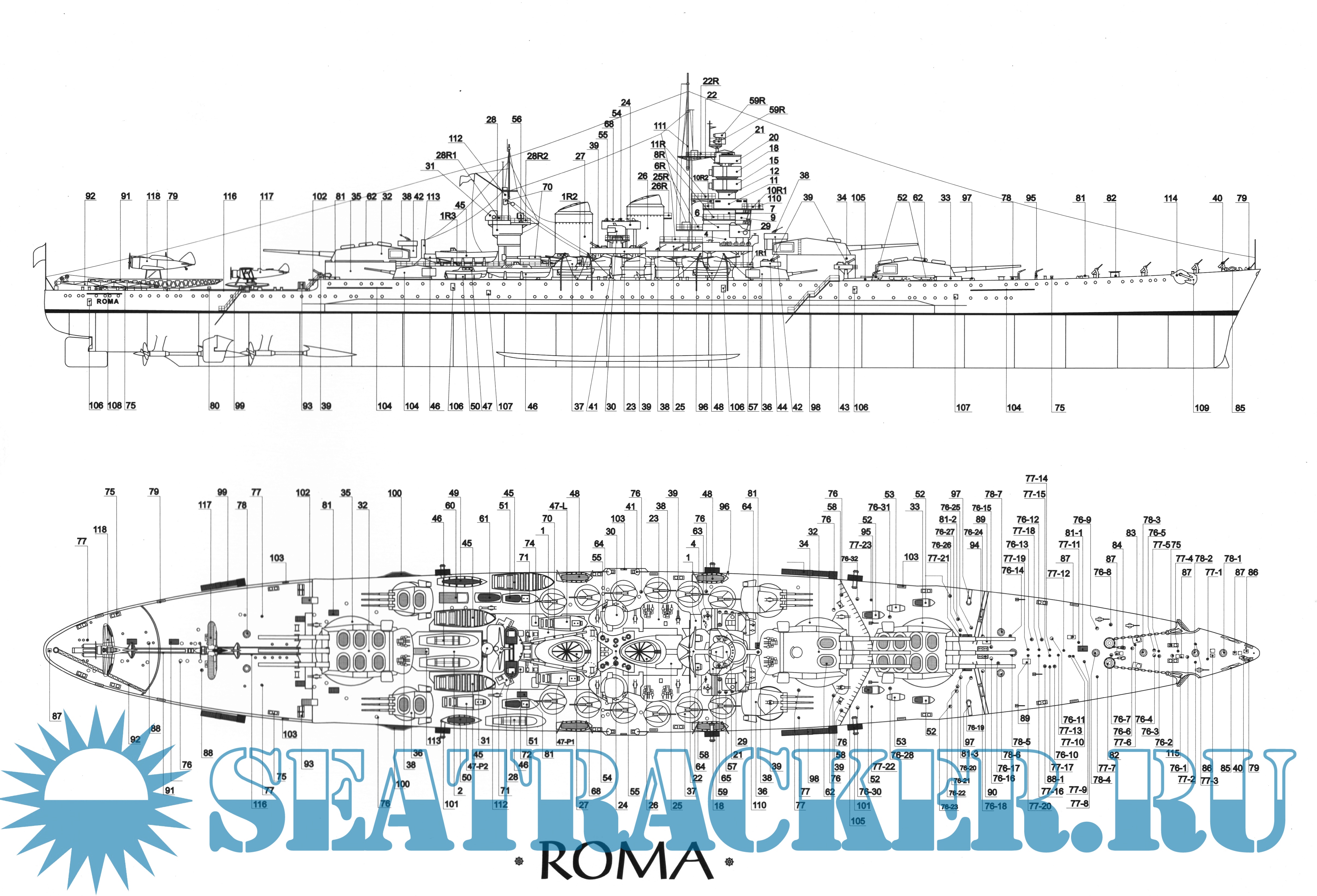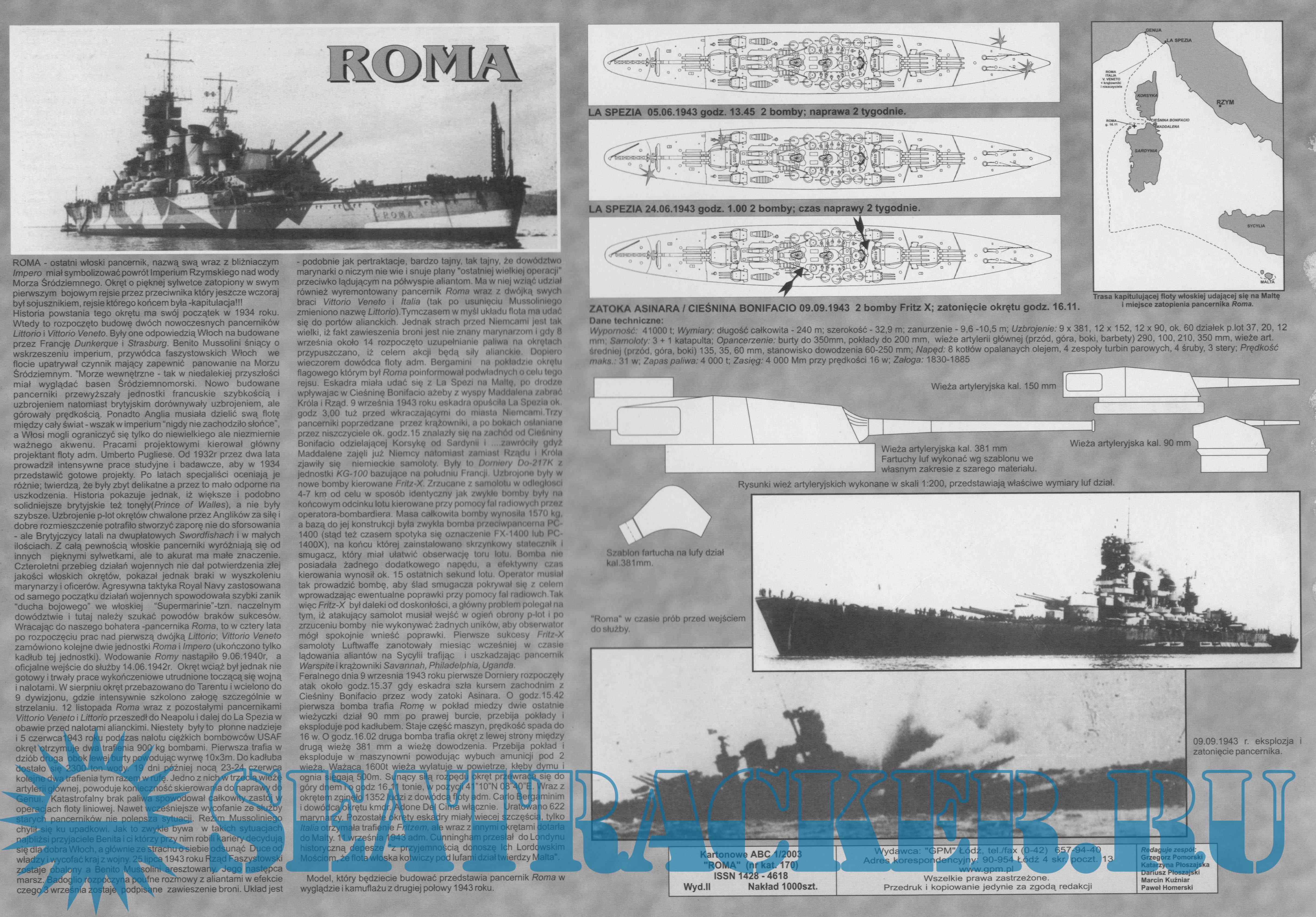 28 листов цветных выкроек и инструкций для изготовления бумажной модели итальянского линкора ''Roma'' в масштабе 1:200