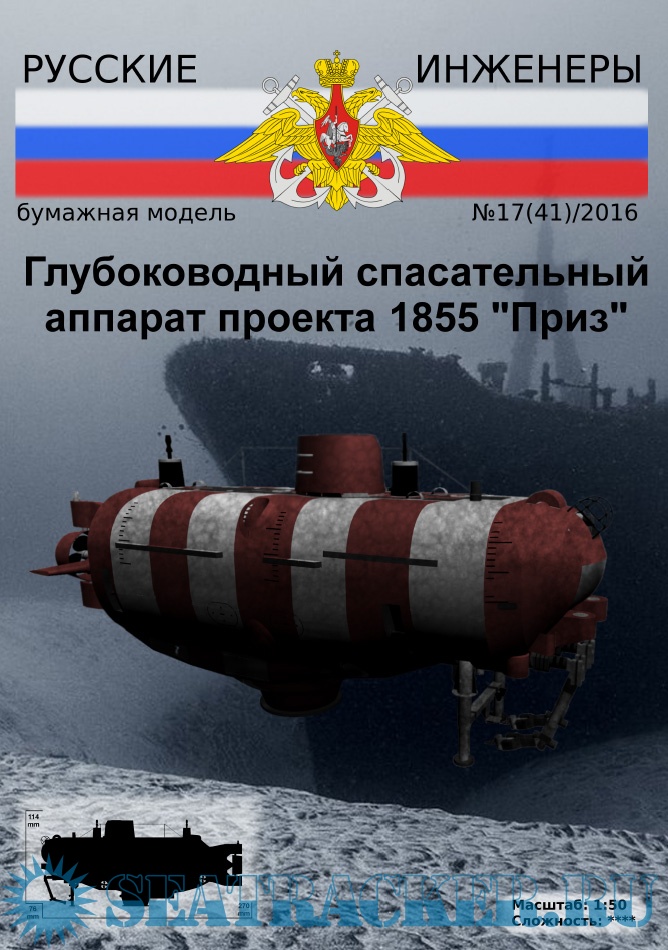 13 листов цветных выкроек и инструкций для изготовления бумажной модели глубоководного спасательного аппарата проекта 1855 ''ПРИЗ'' в масштабе 1:50