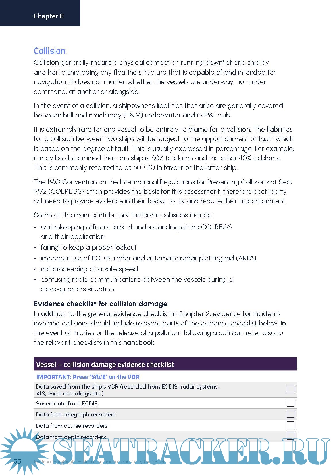 This publication equips readers with the knowledge necessary to demonstrate a ship’s compliance, improve shipboard operations and determine liability when pursuing or defending a claim. Evidence checklists cover areas such as personal illness and performance warranty disputes, meaning crew are prepared for various eventualities. Detail is given on digital evidence types, explaining the practical use of electronic devices such as ECDIS and mobile phones. The publication guides readers on good reporting practice and time management, so that all evidence can be handled sensitively and without delay.