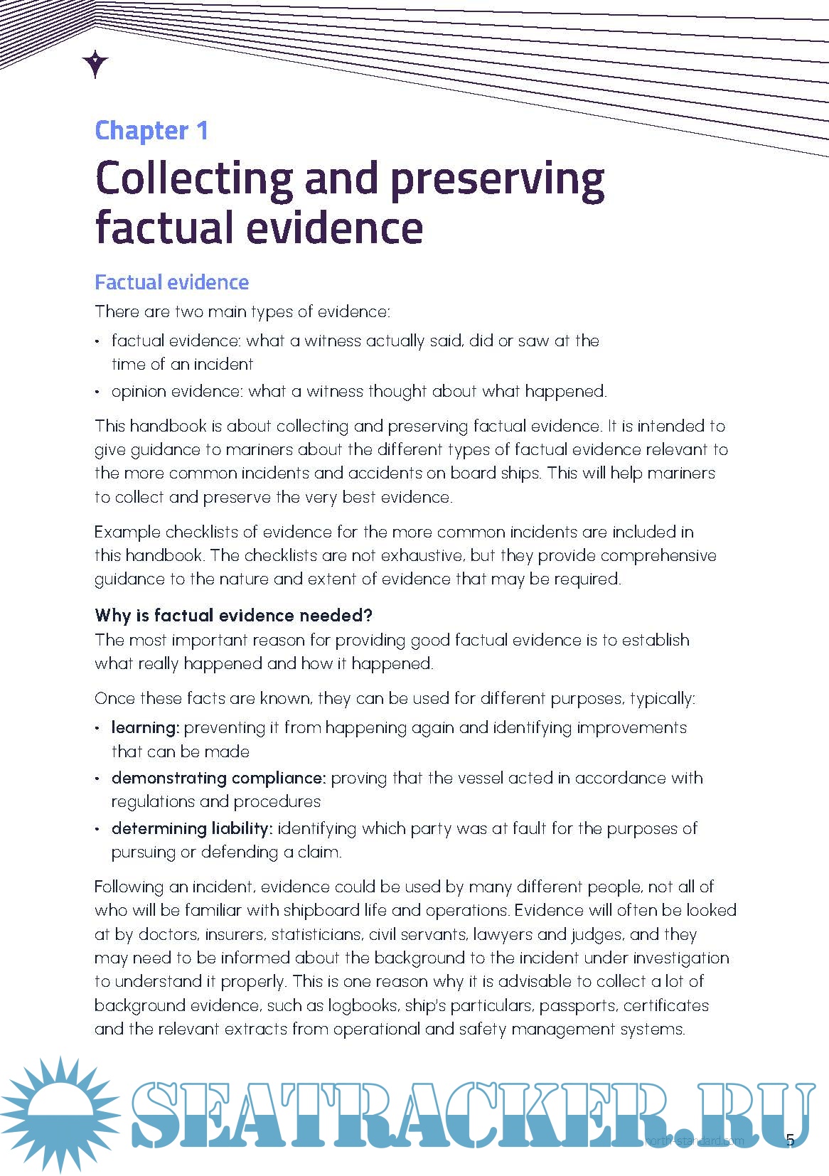 Year: 2024 Language: English Author: NorthStandard Genre: Handbook Publisher: NorthStandard Edition: 2nd Reviewed Edition (September, 2024) ISBN: 9780995565357 Format: PDF Quality: eBook Pages count: 108 Description: This handbook is about collecting and preserving factual evidence, which is vital in establishing what really happened and how it did happen. It is intended to give guidance to mariners about the different types of factual evidence relevant to the more common incidents and accidents on board ships. This will help mariners to collect and preserve the very best evidence. This publication equips readers with the knowledge necessary to demonstrate a ship’s compliance, improve shipboard operations and determine liability when pursuing or defending a claim. Evidence checklists cover areas such as personal illness and performance warranty disputes, meaning crew are prepared for various eventualities. Detail is given on digital evidence types, explaining the practical use of electronic devices such as ECDIS and mobile phones. The publication guides readers on good reporting practice and time management, so that all evidence can be handled sensitively and without delay. Example checklists (fillable) of evidence for the more common incidents are included in this handbook. The checklists are not exhaustive, but they provide comprehensive guidance to the nature and extent of evidence that may be required.