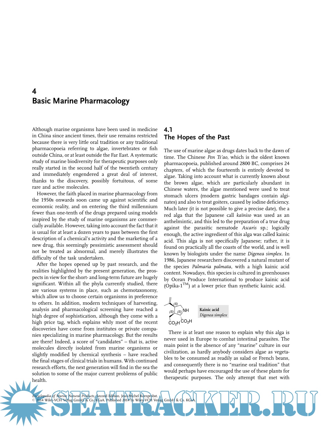 Year: 2014 Language: English Author: Kornprobst J.-M. Genre: Encyclopedia Publisher: Wiley-Blackwell Format: PDF Quality: eBook Pages count: 1864 Description: Now in its second edition and further expanded by 15%, this encyclopedic work is one of the largest resources on marine natural products. It contains an exhaustive and systematic listing of more than 9,000 formulae and 10,000 references with around 650 relevant websites. The unique approach of classifying the compounds by biological species together with their background information makes this particularly useful for marine biologists, and contributed significantly to the overwhelming success of the previous edition. The digital version now features a completely cross-linked library of compounds for easy access to related substances, making it even more useful for biologists, chemists and pharmacologists alike.