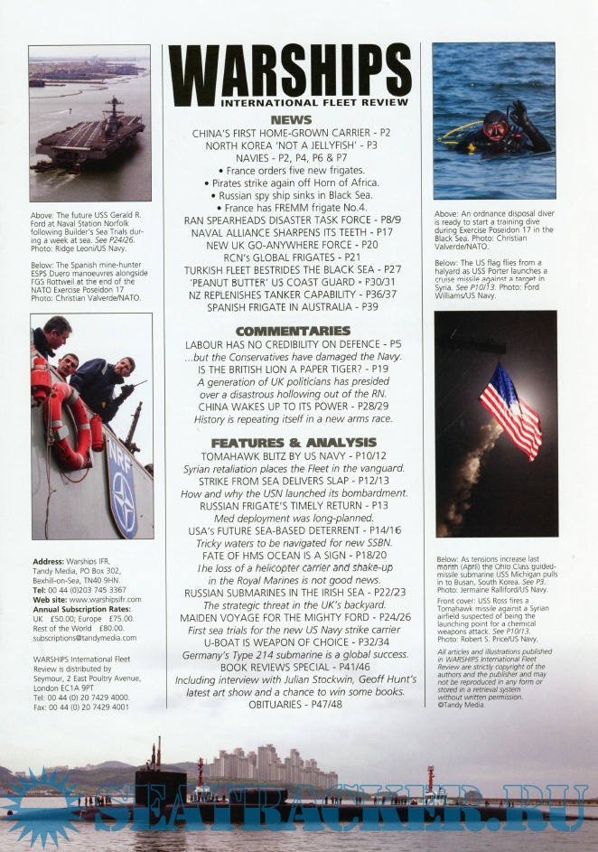 Description: Warships IFR puts the spotlight on the latest developments in the world’s navies. It covers current defence issues and has comments by leading analysts. The magazine regularly includes features on the Royal Navy and the US Navy in addition to incorporating news and features on all other navies across the globe. Warships IFR frequently carries in-depth articles on naval heritage.WARSHIPS International Fleet Review is published 12 times a year by Tandy Media Ltd who also publish Shipping Today & Yesterday (which provides news and features from the world of merchant shipping).