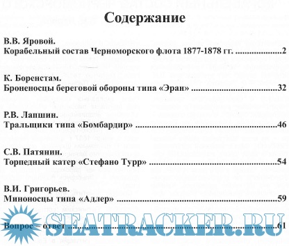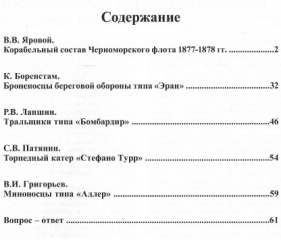 Описание: Основным материалом данного сборника является справочник по корабельному составу российского Черноморского флота в период русско-турецкой войны 1877-1878 гг. Его автор - Виктор Вениаминович Яровой (г. Новокузнецк). Оригинальные схемы для справочника подготовил И.И. Николаевский. Обращаем ваше внимание, что в следующем номере нашего журнала будет опубликовано продолжение, посвященное кораблям турецкого флота.