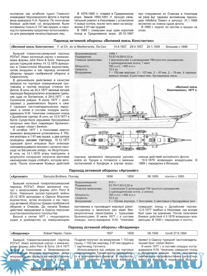 Год выпуска: 2011 Язык: Русский Автор: группа авторов Жанр: Периодическое издание (журнал) Издание: 2011-01 Формат: PDF Качество: Изначально компьютерное (eBook) Количество страниц: 68 Описание: Основным материалом данного сборника является справочник по корабельному составу российского Черноморского флота в период русско-турецкой войны 1877-1878 гг. Его автор - Виктор Вениаминович Яровой (г. Новокузнецк). Оригинальные схемы для справочника подготовил И.И. Николаевский. Обращаем ваше внимание, что в следующем номере нашего журнала будет опубликовано продолжение, посвященное кораблям турецкого флота. Статья шведского историка Курта Боренстама (Curt Borgenstam) рассказывает о самой многочисленной серии броненосцев береговой обороны этой Скандинавской страны. Перевод с английского выполнил М.Б. Князев, графику - Е. Левандовский (Jerzy Lewandowski, Польша). Материалы Романа Витальевича Лапшина (г. Запорожье, Украина), Сергея Владимировича Патянина (г. Саров Нижегородской обл.) и Виталия Ивановича Григорьева (Нижний Новгород) посвящены малоизвестным кораблям отечественного и зарубежного флотов.