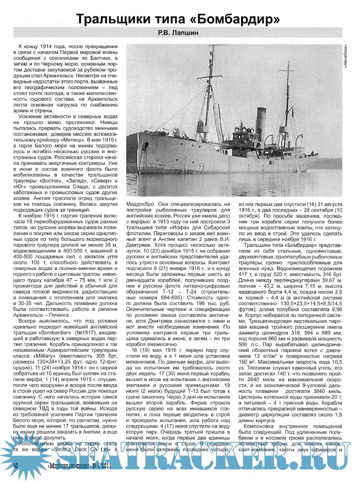 Материалы Романа Витальевича Лапшина (г. Запорожье, Украина), Сергея Владимировича Патянина (г. Саров Нижегородской обл.) и Виталия Ивановича Григорьева (Нижний Новгород) посвящены малоизвестным кораблям отечественного и зарубежного флотов.