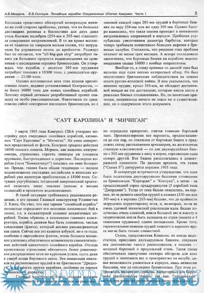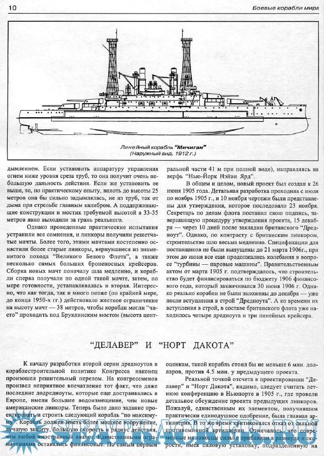 Описание: Строительство американского флота в начале XX века имело ряд интересных особенностей, вытекающих как из географического положения, так и из экономической мощи страны, еще в 1890 г. вышедшей на первое место в мире по объему промышленного производства. Отделенные от основных возможных противников (и союзников) океанами, США уже в силу этого были малоуязвимы для вторжения и могли позволить себе достаточно смелые и даже экзотические эксперименты с типами и конструкцией кораблей (можно вспомнить хотя бы двухъярусные башни и знаменитые ажурные мачты).