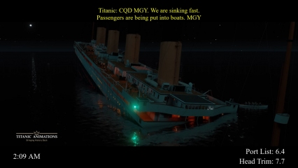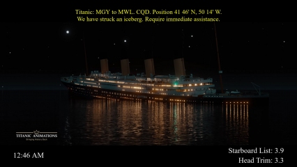 This is our first full-length animation of Titanic's sinking, beginning with the iceberg collision and ending with its disappearance. This is a complete animation, not a short animation that was slowed down to match real-time. The animation includes text frequently appearing with what is happening onboard the ship. This includes visuals of various interior rooms flooding, lifeboats launching, rockets firing, and the SS Californian on the horizon. The animation was created in Unreal Engine 4. The exterior model used is not our final model but an older model created by our team member Kyle Hudak.