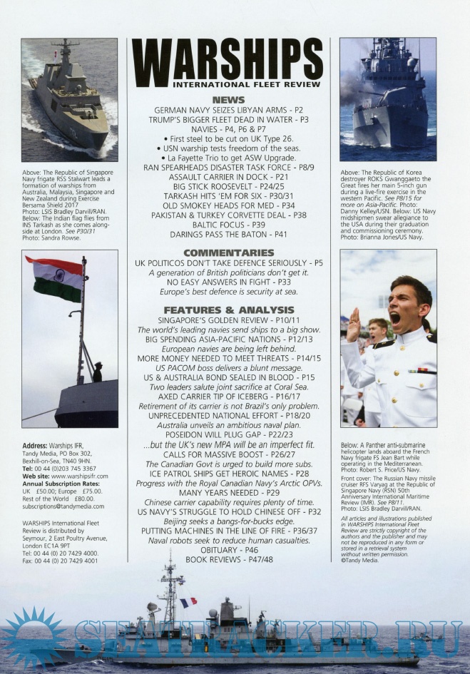 Description: Warships IFR puts the spotlight on the latest developments in the world’s navies. It covers current defence issues and has comments by leading analysts. The magazine regularly includes features on the Royal Navy and the US Navy in addition to incorporating news and features on all other navies across the globe. Warships IFR frequently carries in-depth articles on naval heritage.WARSHIPS International Fleet Review is published 12 times a year by Tandy Media Ltd who also publish Shipping Today & Yesterday (which provides news and features from the world of merchant shipping).