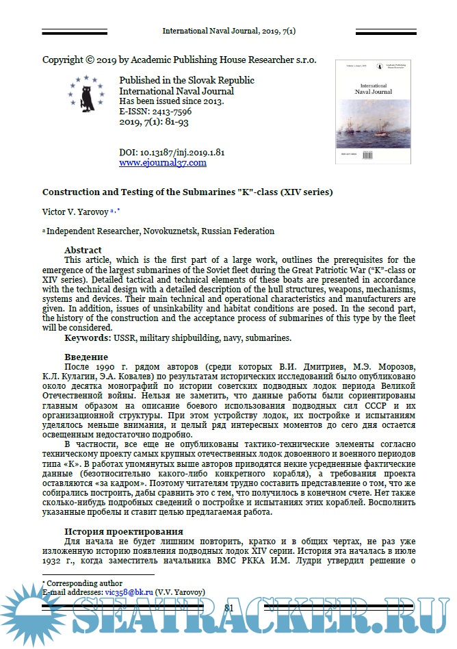 Описание: Миссия журнала заключается в создании международной дискуссионной платформы в области военно-морской истории. В отличие от большинства авторитетных военно-морских исторических журналов, мы позиционируем себя в первую очередь как один из немногих научных журналов в этой области, что предполагает необходимые требования к структурированию работы, ее метаданным, библиографическому описанию, а также процедуре рецензирования.Журнал публикует материалы, статьи и краткие сообщения о результатах исследований в области военно-морской истории, на английском и русском языках. Выходные данные статьи на английском языке.