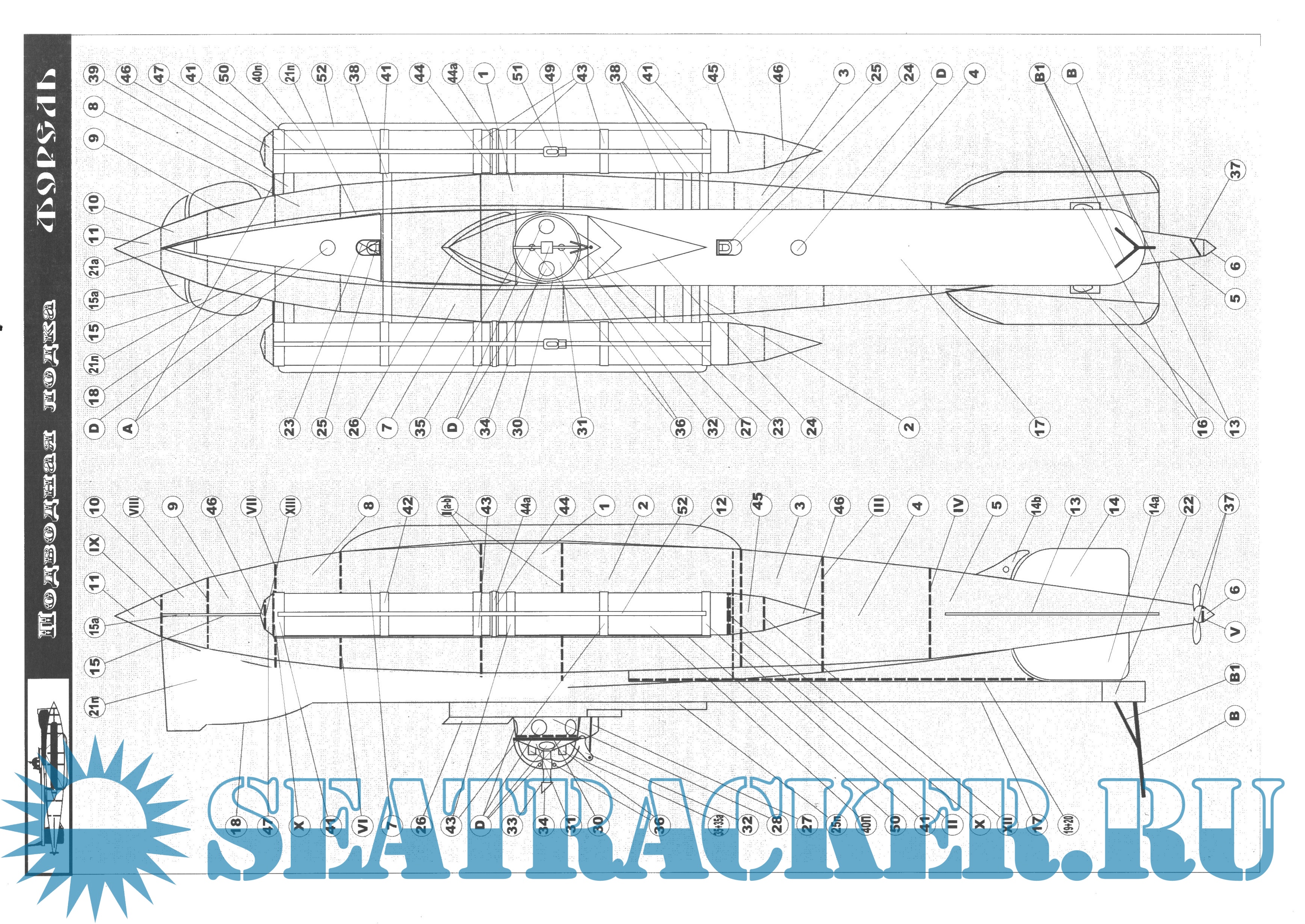 14 листов цветных выкроек и инструкций для изготовления бумажной модели подводной лодки «Форель» 1905 год (Россия) в масштабе 1:50