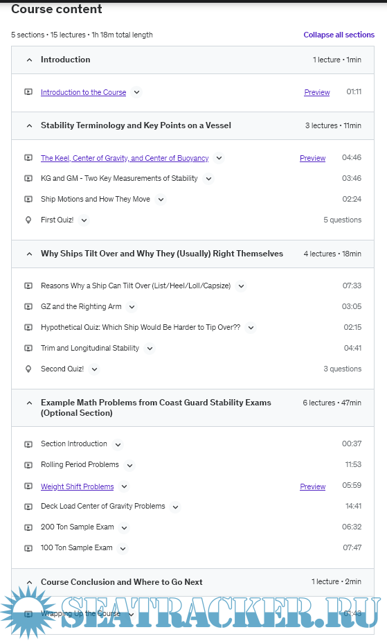 Year: 2023 Author: Udemy (Christopher Nolan) Language: English Playtime: 1:30 Quality: WEB-DL Format: MPEG Video codec: AVC/H.264 Audio codec: AAC Video: 16:9 Audio: 320/48 Description: What you'll learn: - Understand the relationship between the center of gravity and the center of buoyancy - Define traits that make stability better or worse - Understand the righting moment and its impacts on stability - Be prepared for maritime regulatory exams regarding stability