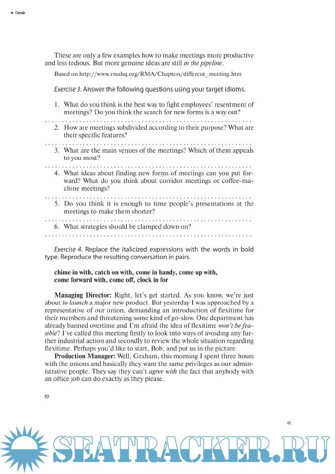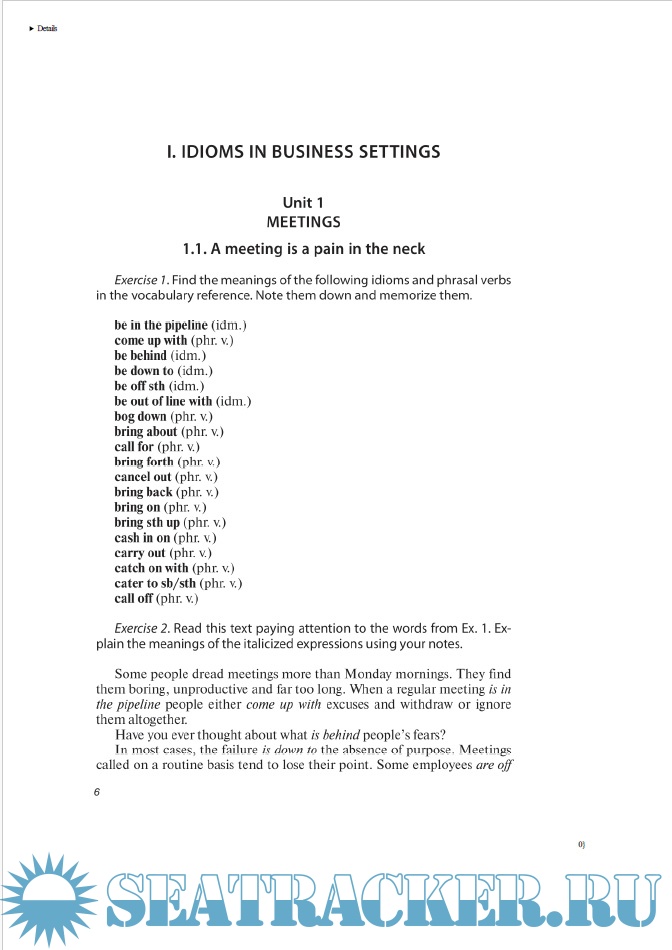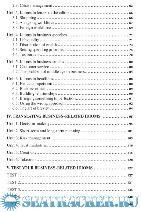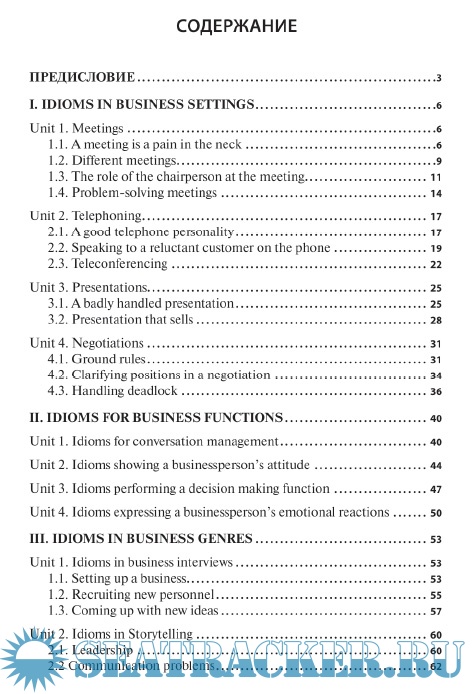 Описание: Учебное пособие закладывает основы понимания проблем делового общения, обогащает словарный запас студентов идиоматическими выражениями и фразовыми глаголами, формирует навык их узнавания и употребления в письменных текстах и разговорной практике, в деловых контекстах и в переводе. В пособии даны примеры применения идиом и фразовых глаголов в жанрах интервью, публичных выступлений, журнальных статьях, письмах к редактору и заголовках, а также в таких сферах деловой коммуникации, как собрания, презентации, переговоры, общение по телефону. Пособие также содержит большое количество упражнений на употребление идиом и фразовых глаголов в различных функциях: для организации информации в сообщении, передачи отношения говорящего к высказыванию, выражения эмоций и чувств деловых партнеров. В пособии имеются тесты для проверки усвоения идиоматических выражений и фразовых глаголов и справочный материал, включающий 325 идиоматических выражения, 142 фразовых глагола и 11 пословиц и поговорок.