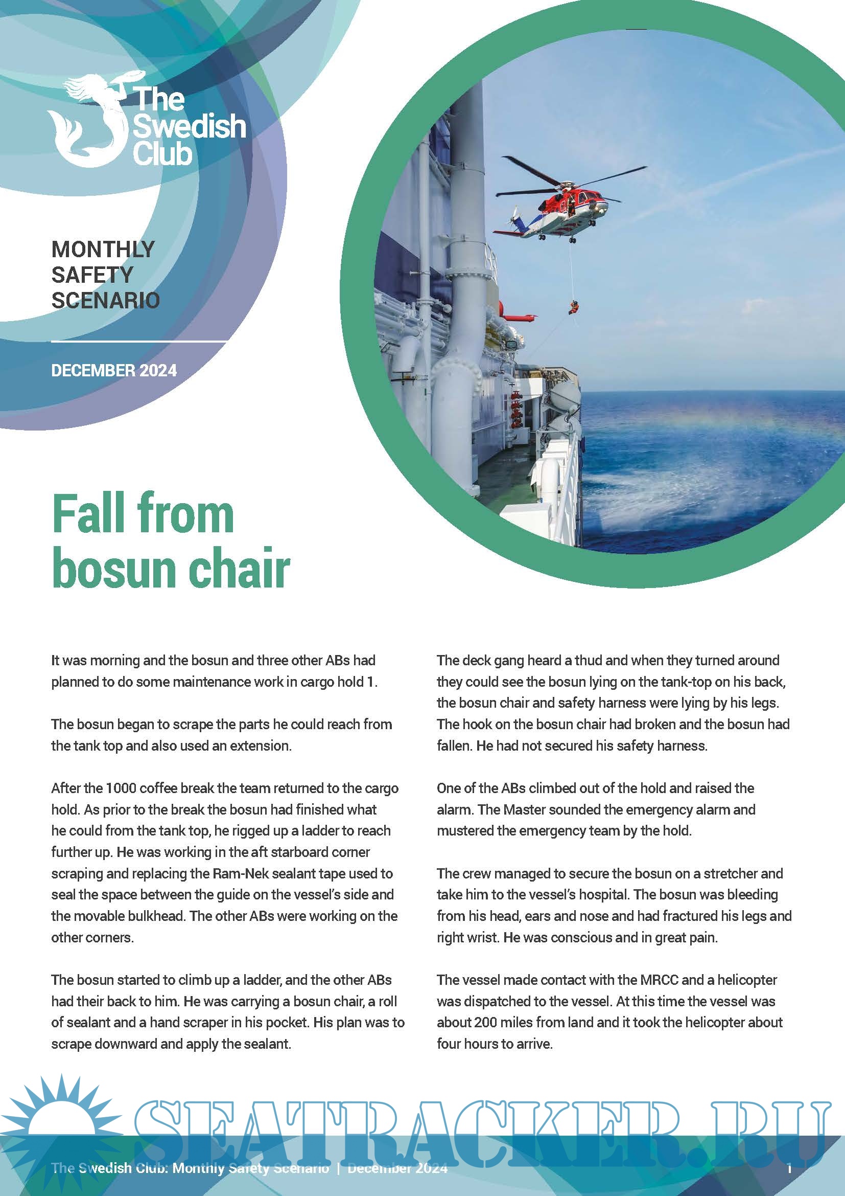 Year: 2024 Language: English Author: the Swedish Club Genre: Periodical publication Edition: December 2024 Format: PDF Quality: eBook Pages count: 3 Description: The Club is publishing, on a monthly basis, a new Monthly Safety Scenario (MSS) to assist owners in their efforts of complying with the above regulations. Alternative scenarios will be uploaded in SCOL. It is easy to download the MSS and enter the written conclusions from the meeting and send feedback to the shore-based organisation. Issue December, 2024 | Fall from Bosun chair. Under the ISM requirement, owners are obliged to carry out monthly safety meetings or safety committee meetings onboard their vessels. This obligation stems from Chapter 5 of the ISM Code: “Master’s responsibility and authority” and furthermore from “5.1.2, motivating the crew in the observation of that policy.