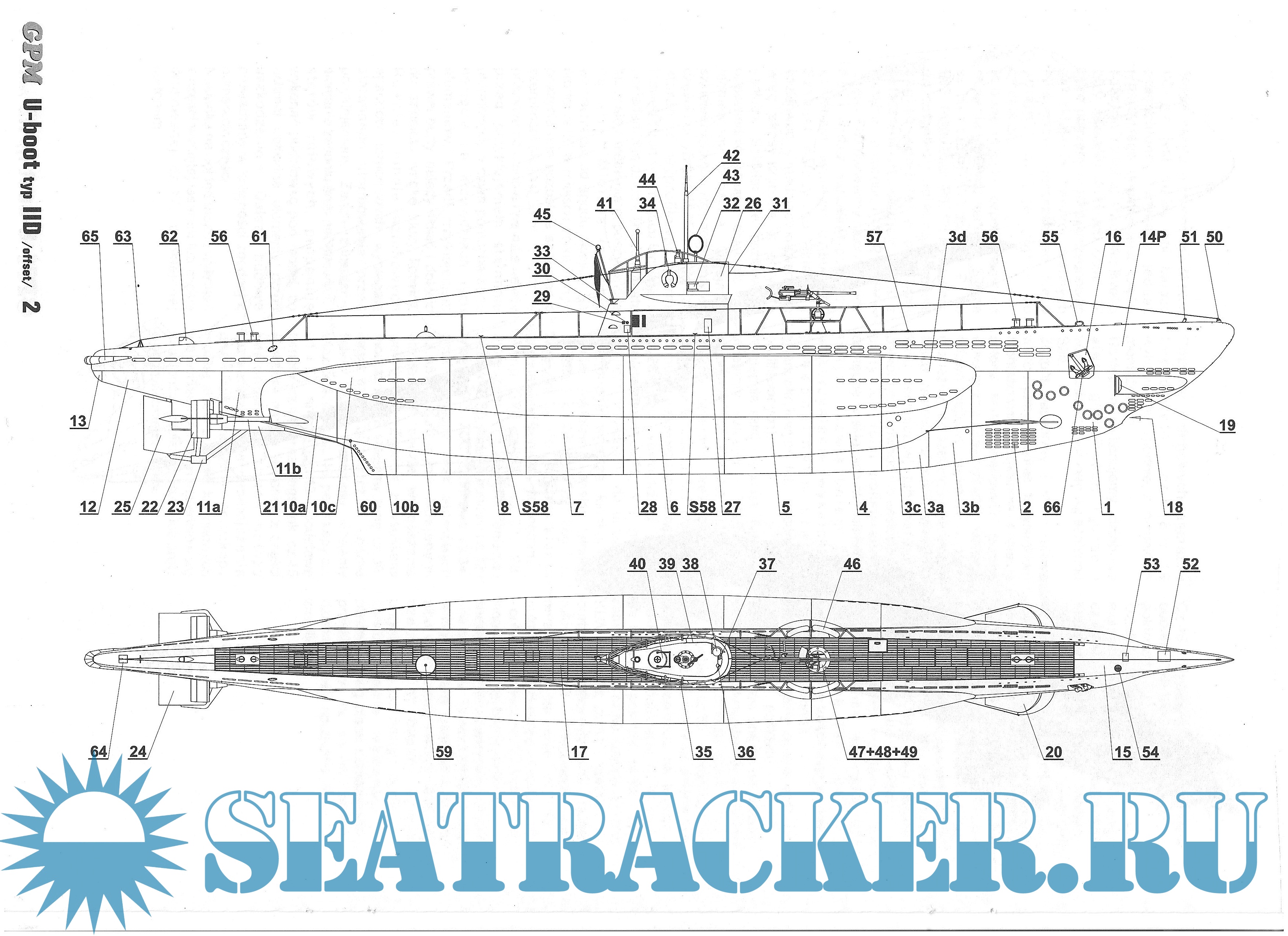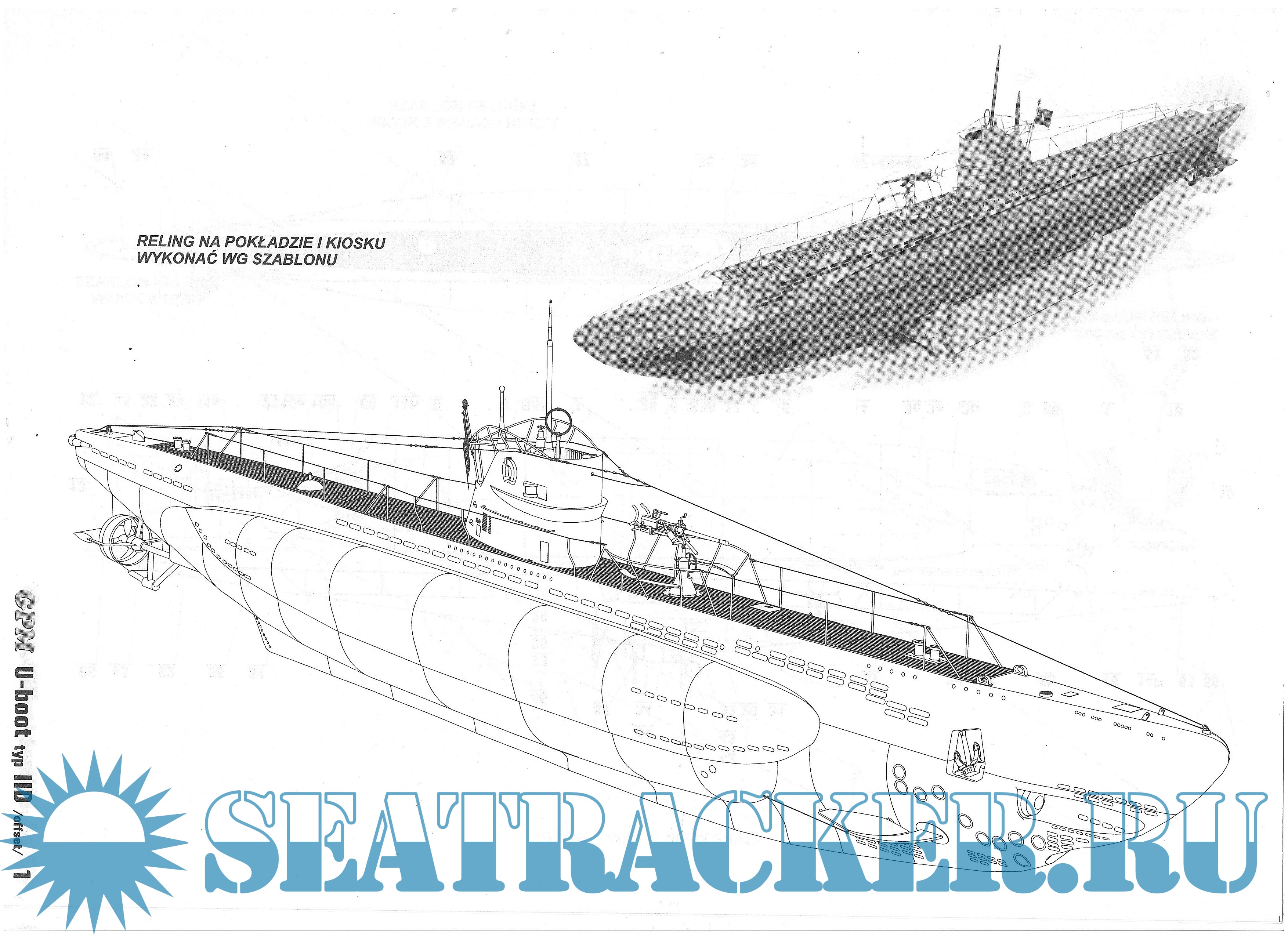 Описание: 20 листов цветных выкроек и инструкций для изготовления бумажной модели немецкой подводной лодки U-141 U-boot typ IID в масштабе 1:100