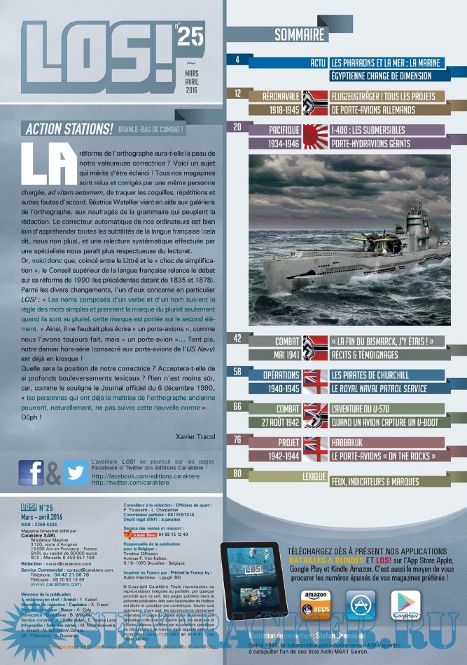 Year: 2016 Language: French Author: Collective Genre: Periodical publication Edition: 2016 03-04 Format: PDF Quality: eBook Pages count: 84 Description: LES ÉDITIONS CARAKTÈRE PRENNENT LE LARGE EN LANÇANT UN NOUVEAU MAGAZINE CONSACRÉ À LA GUERRE NAVALE !Les sujets passionnants ne manquent pas et LOS ! met un point d’honneur à les présenter au lecteur comme cela n’a jamais été fait dans la presse française jusqu’à présent. Un seul mot d’ordre pour l’équipe rédactionnelle : rigueur scientifique et présentation ludique !S’appuyant sur un fond photographique d’exception, sur des plans de bateaux et d’avions, les éditions Caraktère innovent une fois de plus en vous proposant aussi des vues 3D détaillées, le tout au service de textes soigneusement rédigés par des auteurs spécialisés. Vous comprendrez ainsi comment fonctionne un submersible, comment se déroule un combat naval, comment est conçu un cuirassé ou comment attaquent les avions-torpilleurs !Revivez au fil des pages l’aventure humaine exceptionnelle des matelots de la marine marchande affrontant les U-Boote en Arctique, ou celle des pilotes embarqués sur les porte-avions américains et japonais. Lisez les exploits des hommes-grenouilles italiens en Méditerranée, des équipages des vedettes lance-torpilles dans la Manche, des sous-marins soviétiques de la guerre froide ou des grands cuirassés de 1914-18