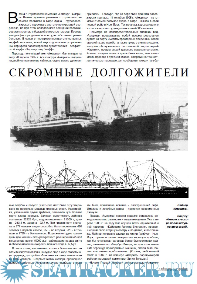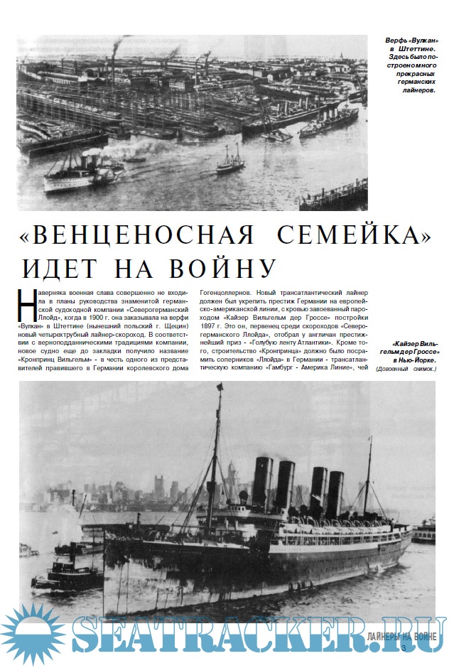 Первая часть книги посвящена лайнерам, построенным до Первой мировой войны таким, как «Кронпринц Вильгельм», «Лузитания», «Олимпик», «Британник», «Фатерлянд» и некоторым другим.