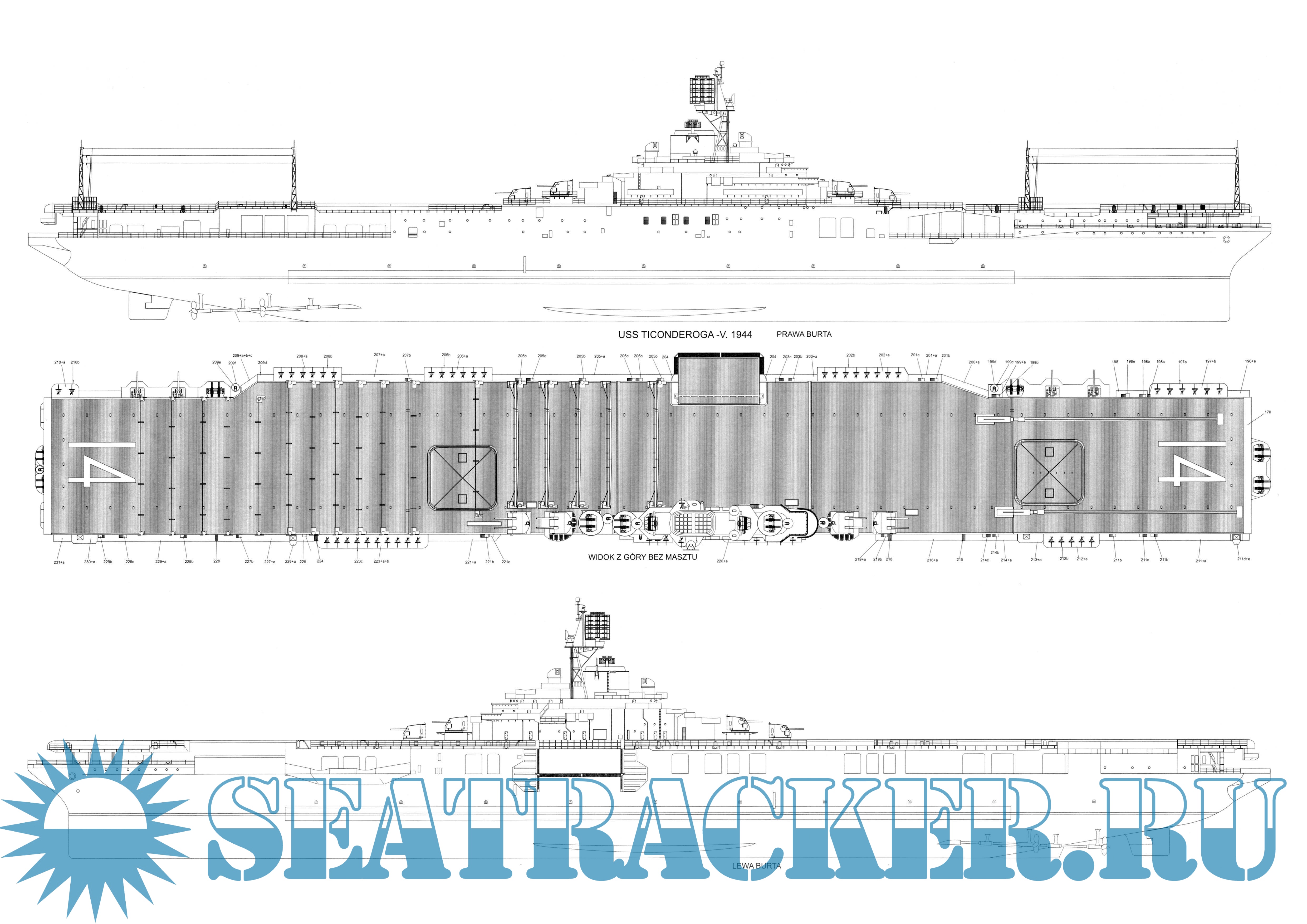 48 листов цветных выкроек и инструкций для изготовления бумажной модели авианосца США USS Ticonderog в масштабе 1:200