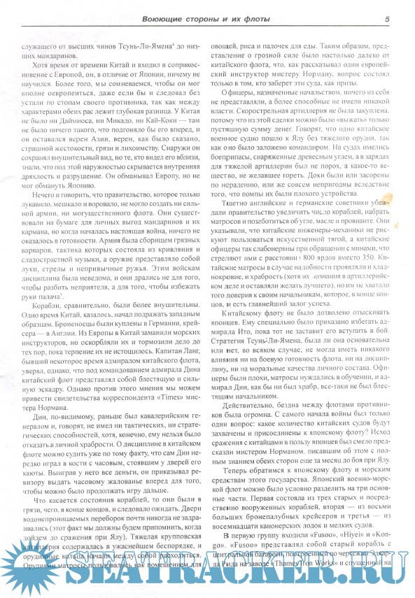 Описание: Предлагаемая вниманию читателя работа является главой классического труда выдающегося английского военно-морского историка Х.В. Вильсона «Броненосцы в бою» ( «Ironclads in action»), изданного в 1896 году в Санкт-Петербурге Военно-морским ученым отделом Главного морского штаба. Книга эта давно стала библиографической редкостью. Между тем, боевые действия на море в период японо-китайской войны, имевшие прямое влияние на развитие кораблестроения и военно-морского искусства накануне трагической для нашего Отечества и флота войны русско-японской, пожалуй, так и не получили с тех пор более подробного и, вместе с тем, столь же красочного и живого описания.