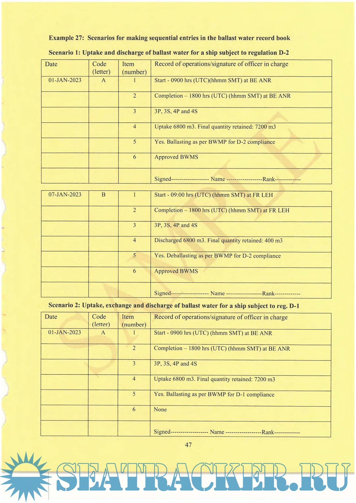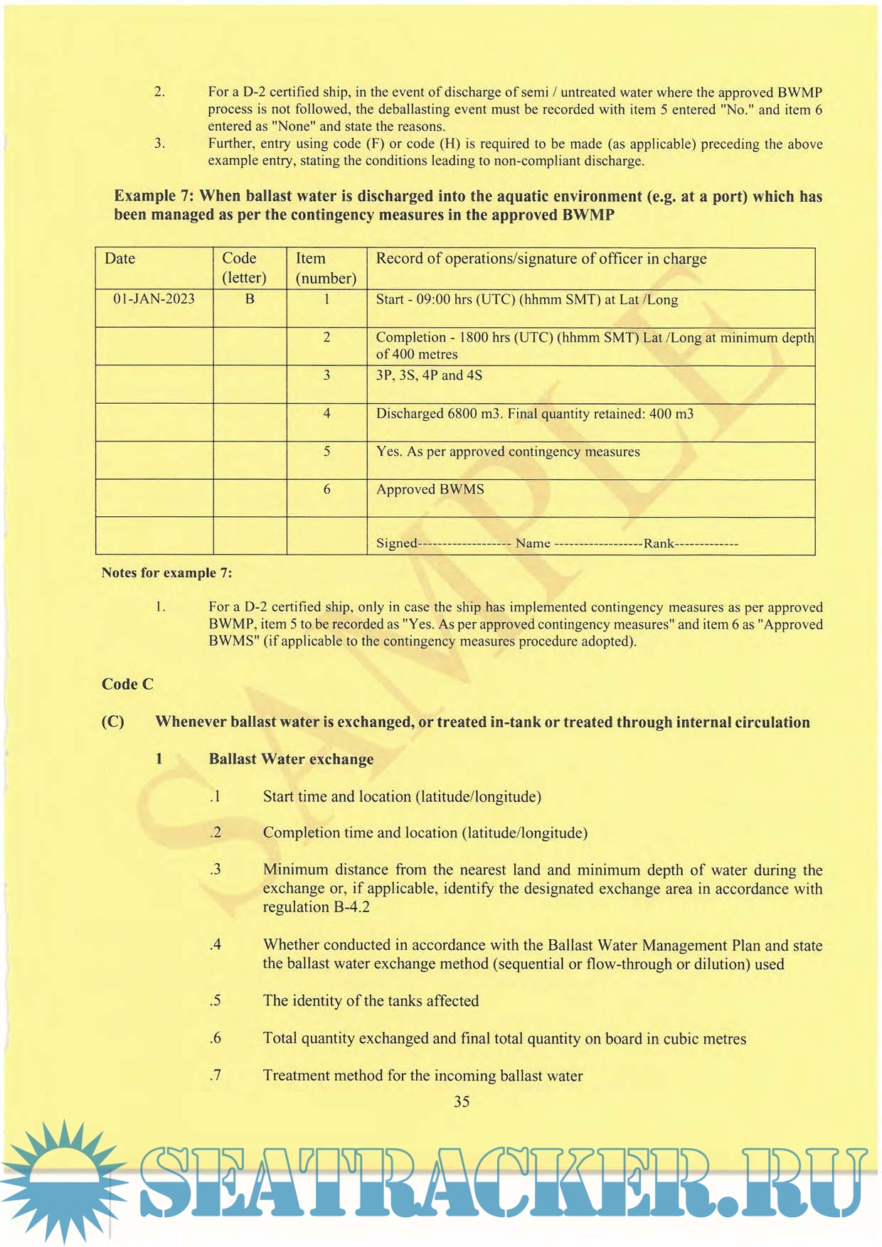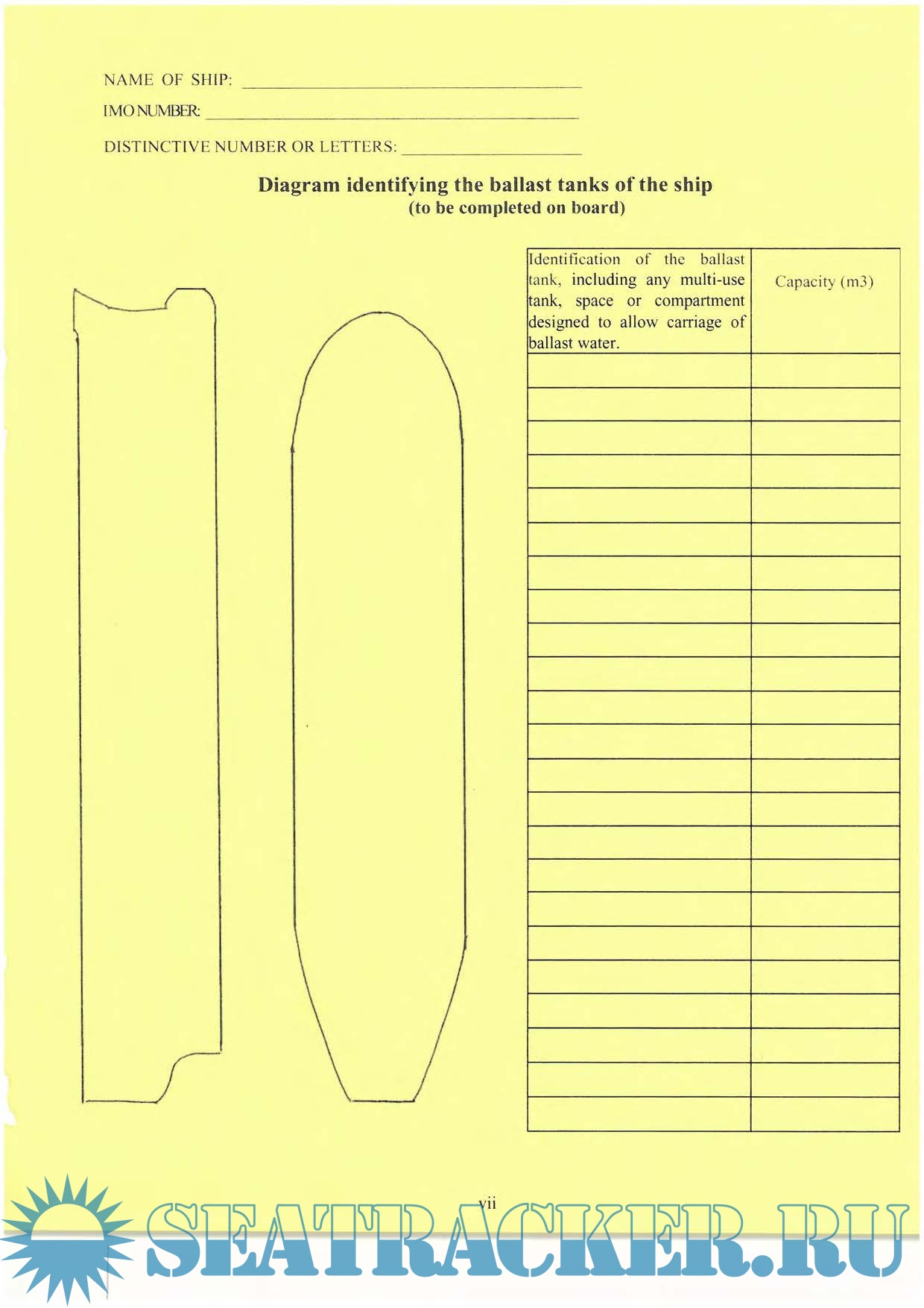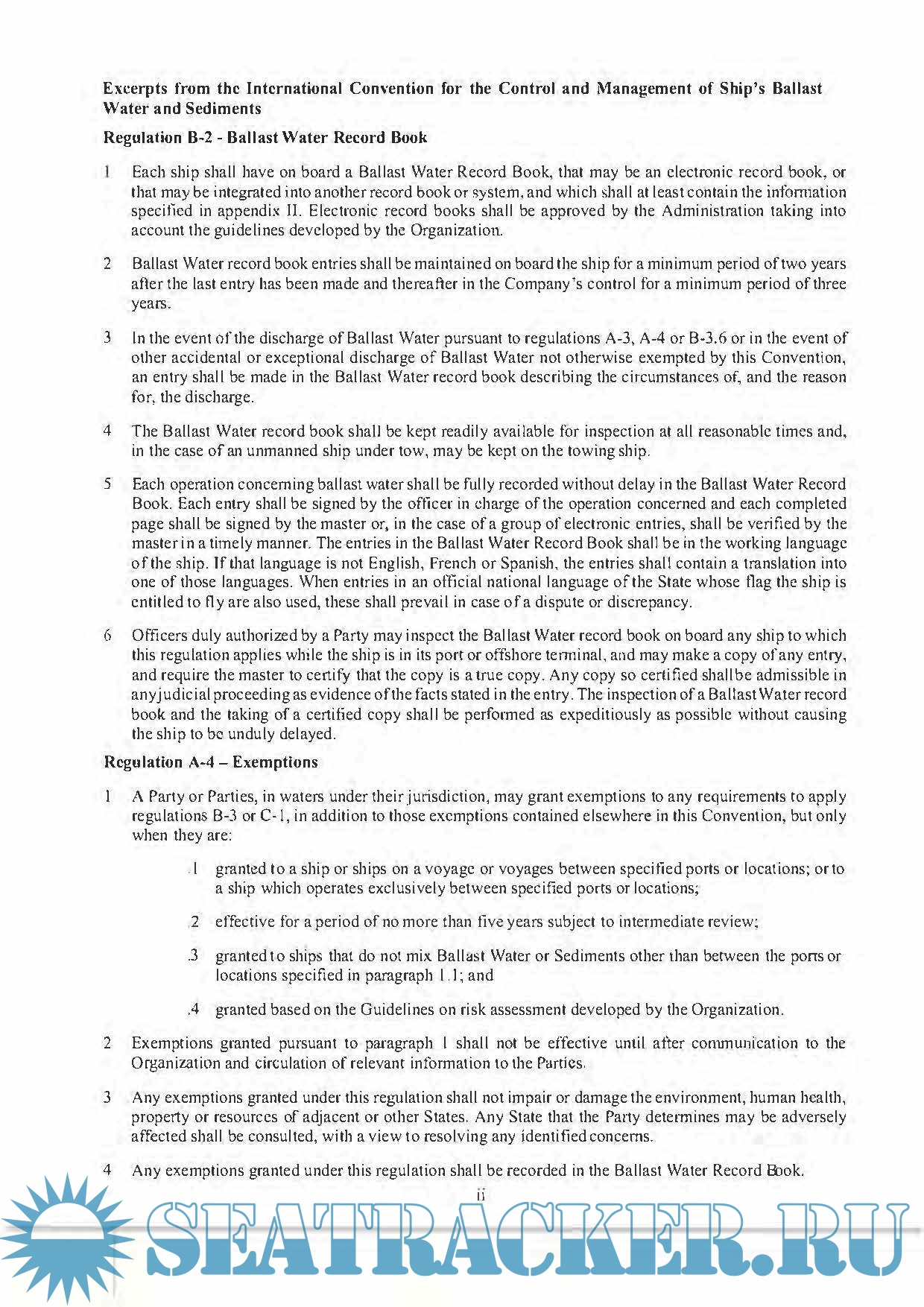 Together with the enclosed instructions, this is the Official Ballast Water Record Book of the Maritime Administrator. This Book has been designed so that it may be used by ALL ships for recording ballast water operations. In accordance with regulation 8-2 of the annex to the International Convention for the Control and Management of Ship's Ballast Water and Sediments, a record is to be kept of each ballast water operation. Each ship shall have on board a Ballast Water Record Book, that may be an electronic record book, or that may be integrated into another record book or system, and which shall at least contain the information specified in appendix II.