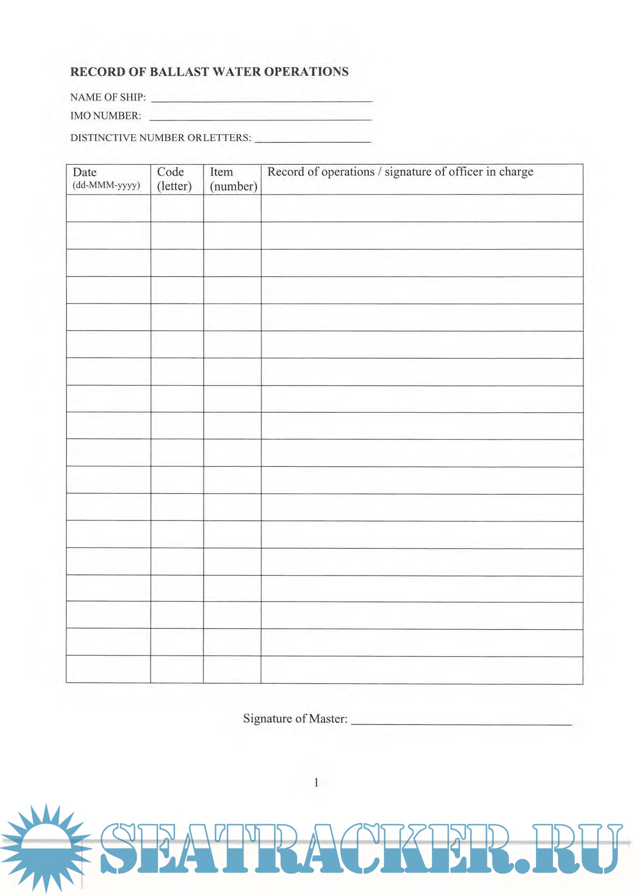 Additional info: Page named "RECORD OF BALLAST WATER OPERATIONS" to be printed up to 50 times (with sequential page numbering).