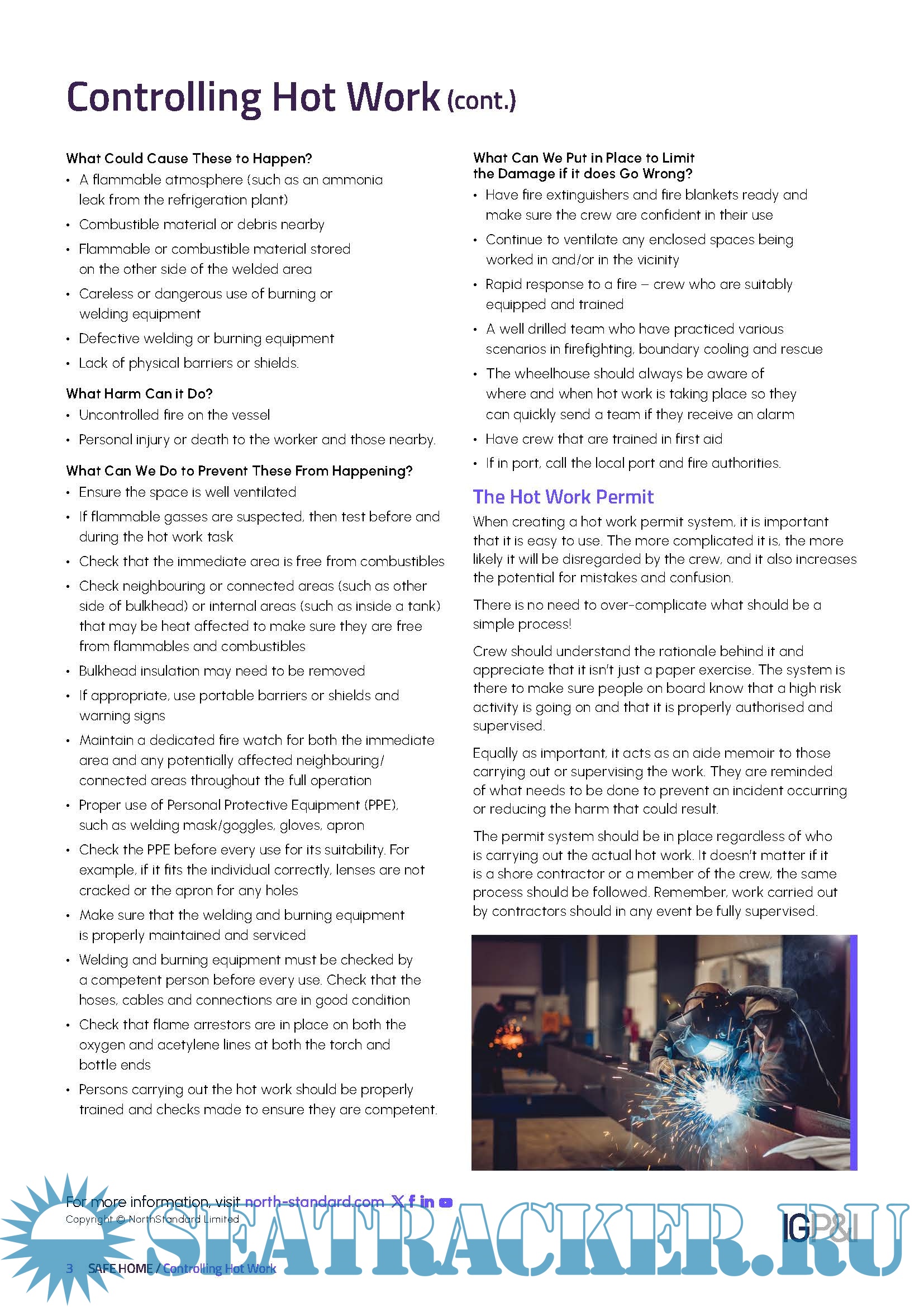 Fire on board a vessel can be devastating. Fire can originate from a number of sources, but a major cause is hot work that was carelessly conducted, or when defective equipment was used. The risk of damage and injury from hot work has long been identified. In many industries hot work operations are controlled. A widely used method is the permit-to-work system.