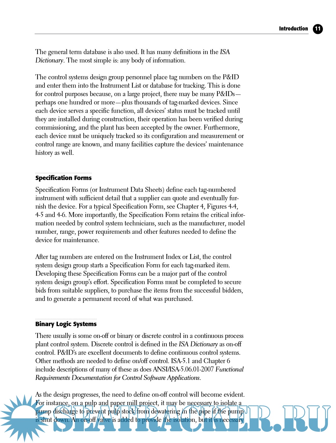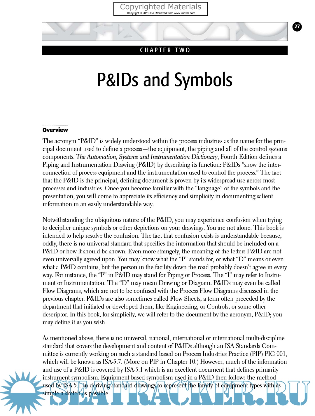 Year: 2011 Language: English Author: Frederick A. Meier, Clifford A. Meier Genre: Practical guide Publisher: International Society of Automation Edition: 2nd Edition ISBN: 978-1-936007-51-6 Format: PDF Quality: eBook Pages count: 206 Description: This book provides the knowledge needed to understand and develop the documents and symbols that define a modern industrial measurement and control system. In addition, it uses industry standards, especially ANSI/ISA-5.1-2009 - Instrumentation Symbols and Identification, to define and describe the symbol based “language” that identifies measurement and control devices. The documents that describe modern industrial processes, like most technical work, assume some level of understanding on the reader's part. The documents use a schematic, symbol-based "language" that may resemble Mayan hieroglyphics to those unfamiliar with the process nomenclature. The symbols, however, include a wealth of information once you are able to translate them. This book will train you to read, understand, and apply the symbols and documents used to define a modern industrial instrumentation and control system. For more experienced professionals, insights into using the symbols and documents more effectively are provided. Variations in the use of symbols and documents are given as well as the pitfalls to avoid. To better understand process documentation today, insight into how and when documents are developed, who develops them, why they are developed, and how they are used is provided. The types of documents discussed include process flow diagrams, piping and instrumentation drawings, instrument lists, specification forms, logic diagrams, installation details, location plans, and loop diagrams. The purpose and content of these documents, as well as options with regard to the information presented, are discussed in detail. Information is presented in the timeline of a typical design and engineering project. The sequence serves to show how the documents evolve and how they are interrelated. The real-world obligation of control systems documentation to support interdisciplinary coordination during design, to provide sufficient detail to bid and purchase components and services and to support all construction work is addressed. The critical requirement that these drawings and data present critical information for on-going maintenance work is integral to this presentation. See also: