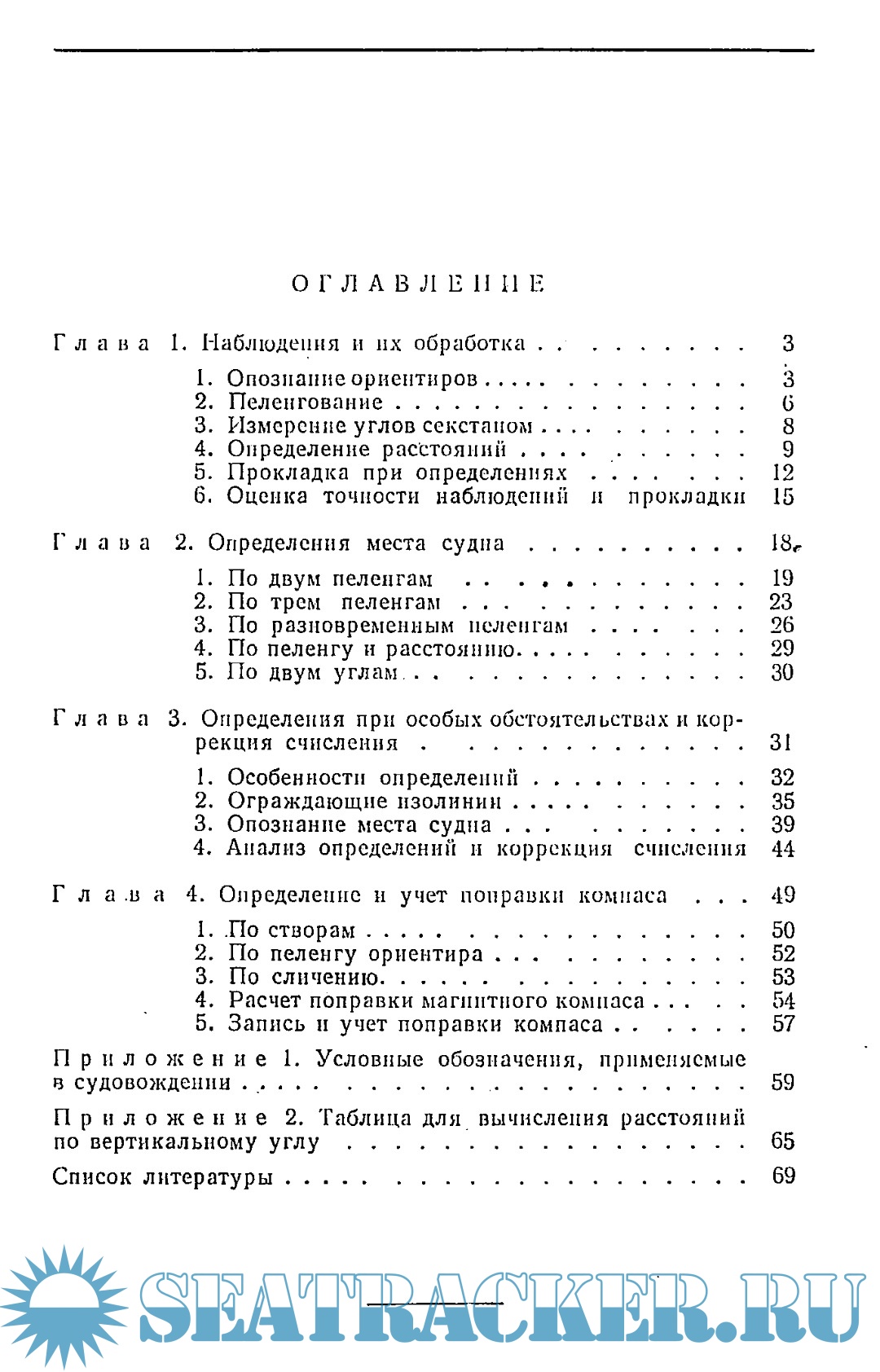Материал дается в виде отдельных практических рекомендации по выполнению наблюдений, их обработке, прокладке на карте и правильным записям в судовом журнале. Все рекомендации иллюстрируются числовыми примерами и образцами прокладки.