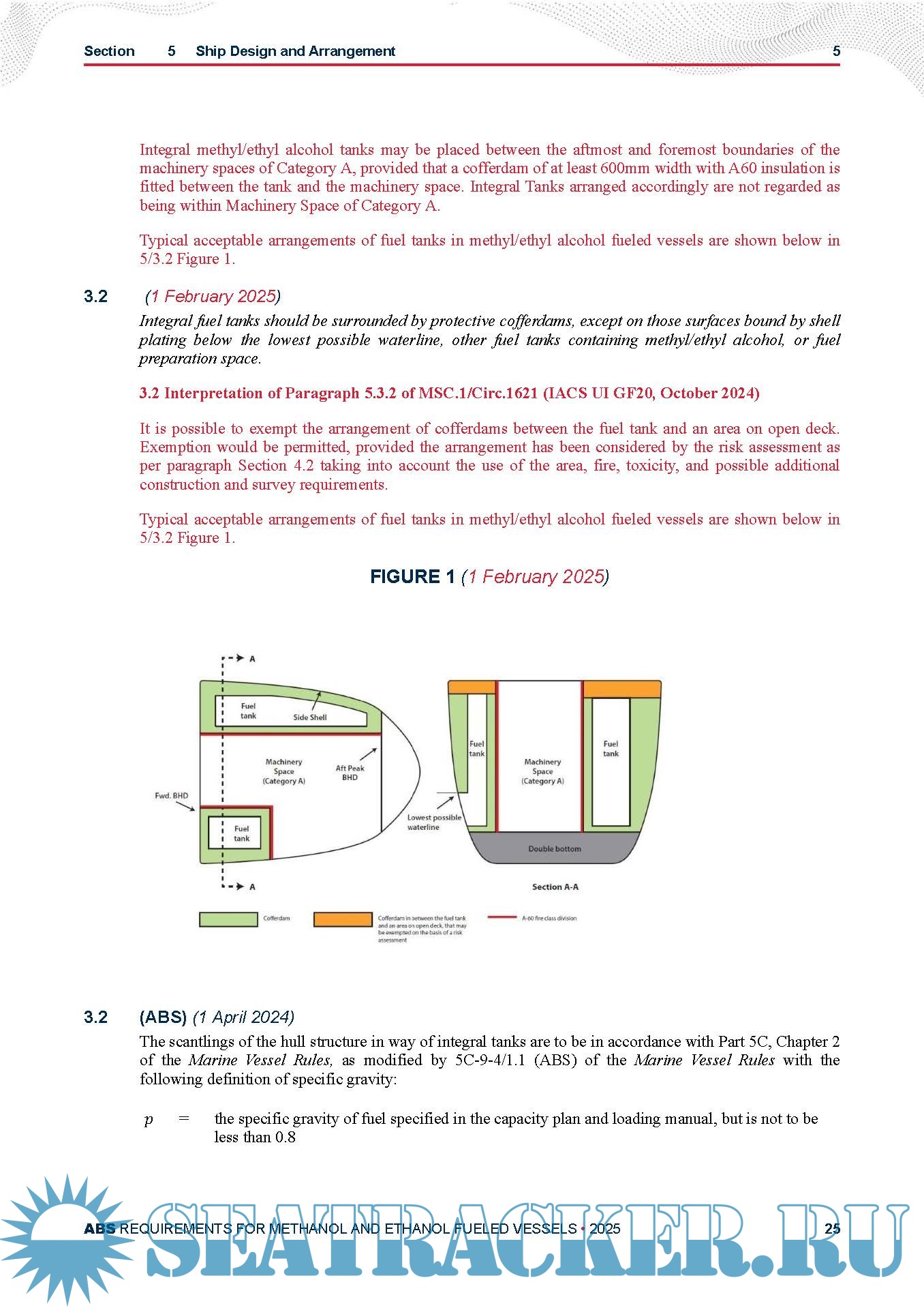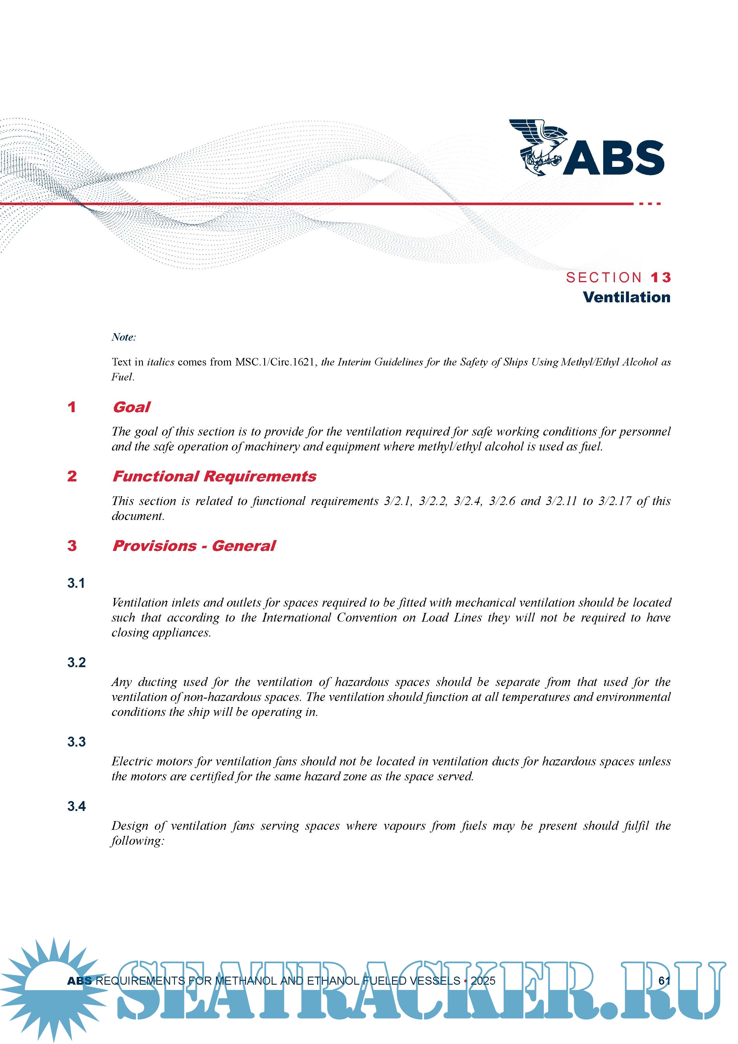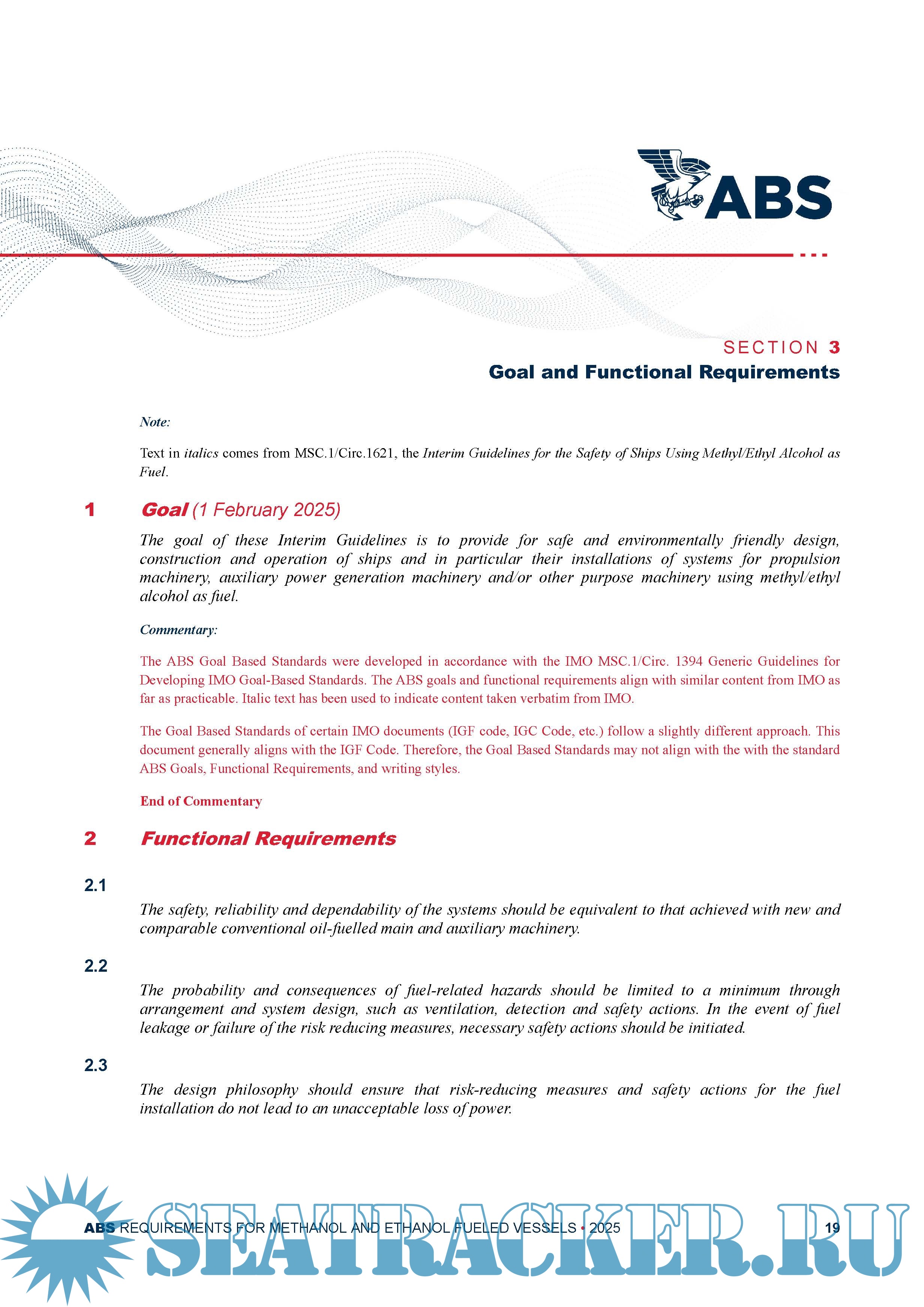 Text in italics comes from MSC.1/Circ.1621, the Interim Guidelines for the Safety of Ships Using Methyl/Ethyl Alcohol as Fuel. Operational, training or national requirements are shown in italics and are not required for Classification and are shown for information only.