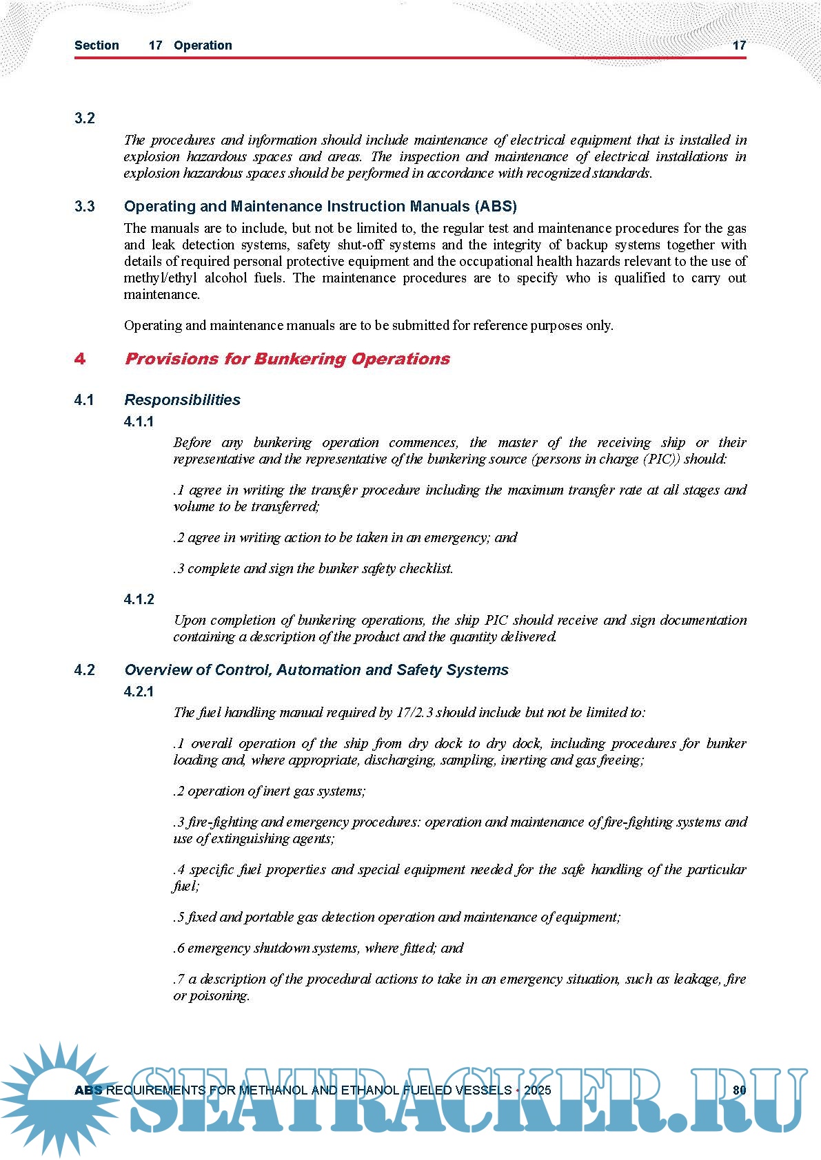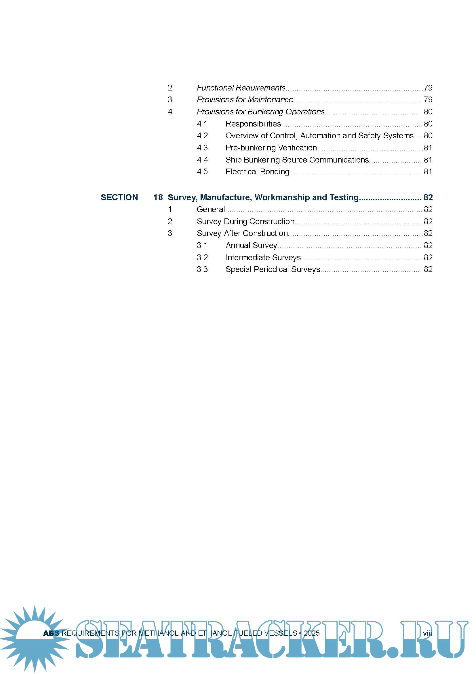 Year: 2025 Language: English Author: American Bureau of Shipping (ABS) Genre: Guide, Textbook Edition: February 2025 Format: PDF Quality: eBook Pages count: 83 Description: This document provides requirements for the design, construction, and survey of vessels using methanol or ethanol as fuel for propulsion and auxiliary systems and incorporates IMO’s MSC.1/Circ.1621. This document provides Classification criteria for the arrangements, construction, installation and survey of machinery, equipment and systems for vessels operating with methanol or ethanol as fuel in order to minimize risks to the vessel, crew and environment. Text in italics comes from MSC.1/Circ.1621, the Interim Guidelines for the Safety of Ships Using Methyl/Ethyl Alcohol as Fuel. Operational, training or national requirements are shown in italics and are not required for Classification and are shown for information only.