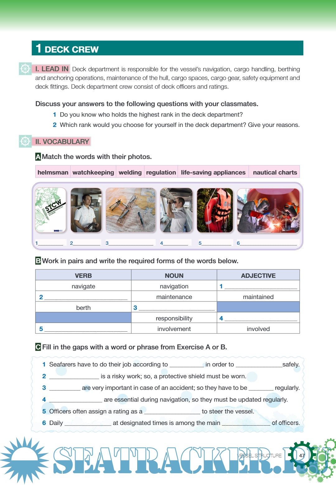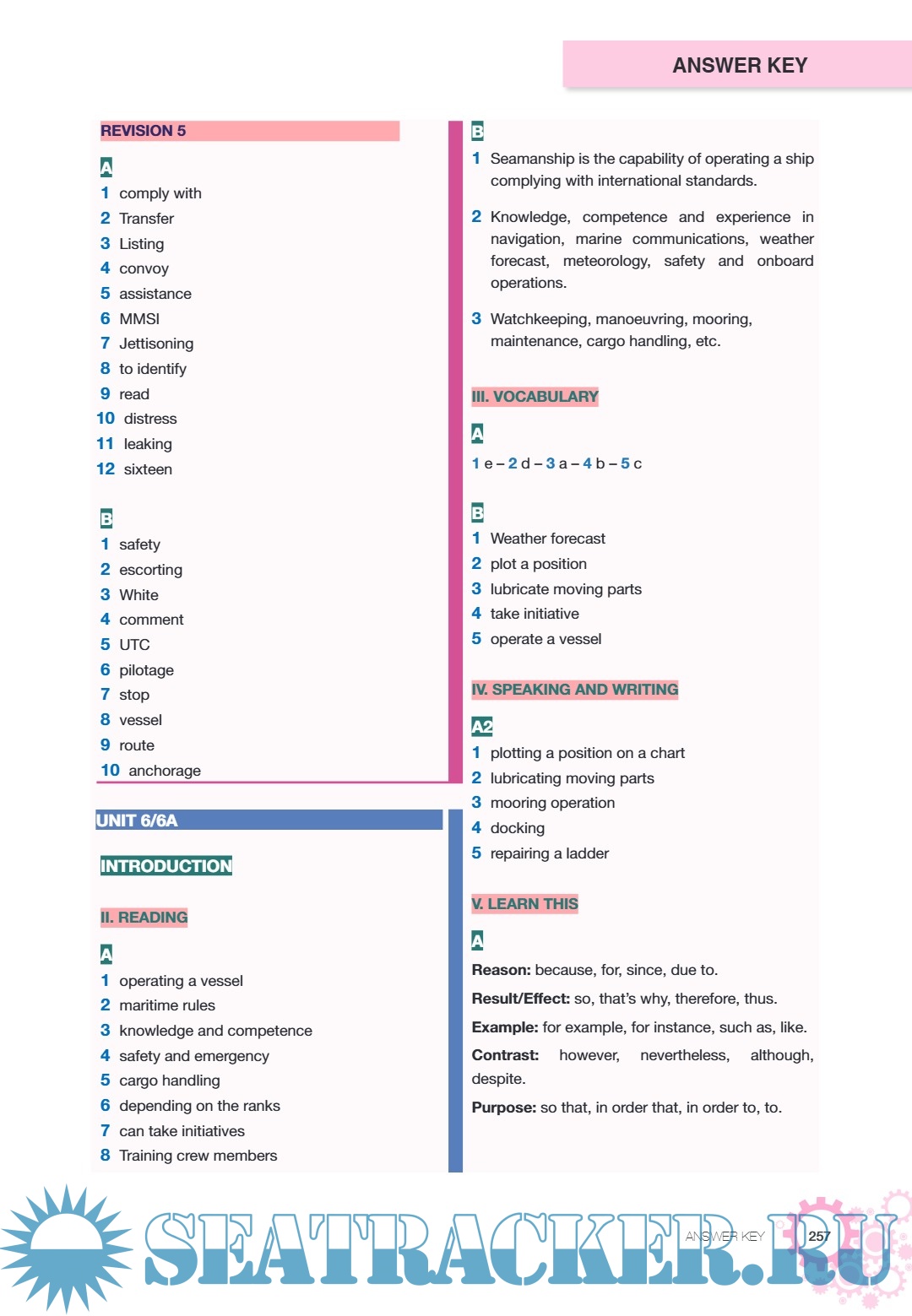 Year: 2020 Language: English Author: A. Kaplan Misirlioglu, C. Kelesoglu Genre: English Course for Students ISBN: - Format: PDF Quality: eBook Pages count: 267 Description: Prepared as a course material by the Directorate General of Vocational and Technical Education with the approval of the Ministry of National Education. Each part has an introduction to get you familiar with the basic terms, and “Lead in” activities are aimed to prepare and warm you up to the subjects covered in that part. Vocabulary, reading, writing, speaking and language activities in each unit are designed for developing basic skills in foreign language. Group and pair activities are also placed to increase your participation. At the end of each part, a project is suggested to you. You can work in groups which we hope you can enjoy a team work. We aimed to get you in contact with the people in maritime sector and lead you in the real environments of maritime sector. Additionally, at the end of each unit there is a self assessment part that you can evaluate your progress; and a revision part that you can check your knowledge.