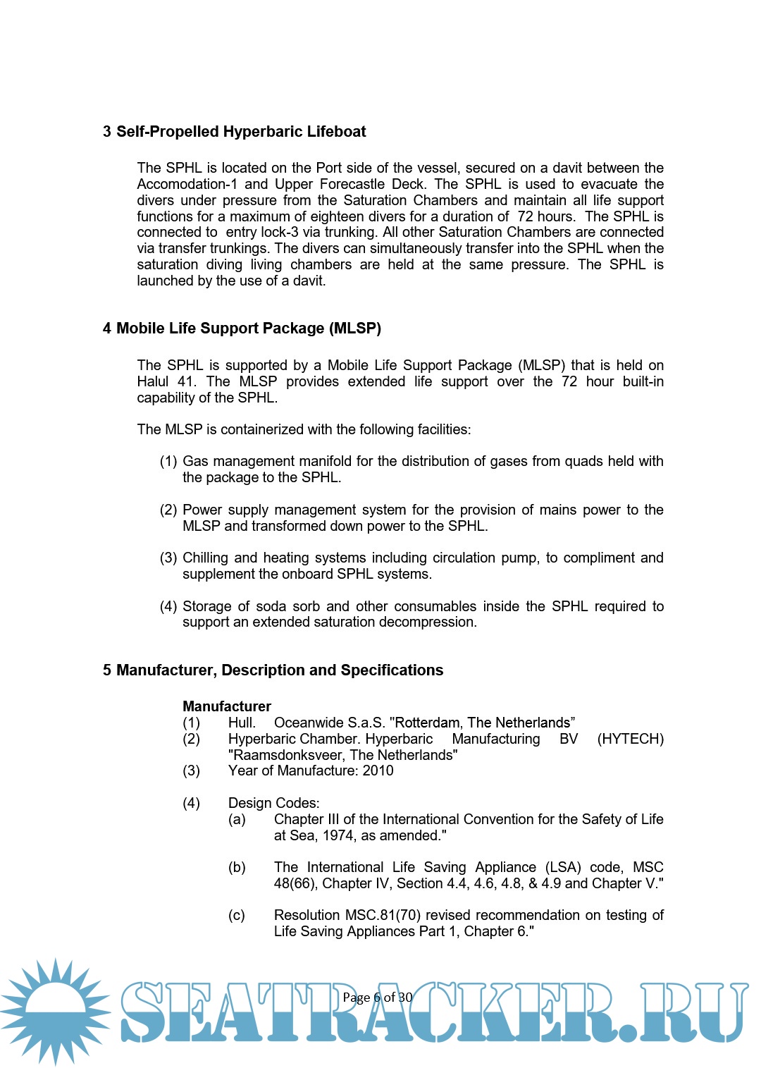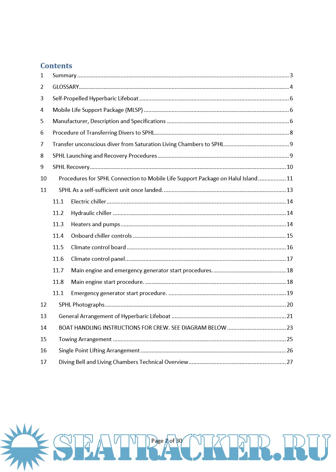 This document goes past what can be termed as foreseeable emergencies to extreme circumstances where emergency procedures and operations for launching the Self Propelled Hyperbaric Lifeboat (SPHL) or Diving Bell have not been possible due to massive structural damage, fire, massive flooding or capsizing of the DSV Shaddad, or where the designated personnel are unable to carry out the emergency procedures in time. During such emergencies, the Diving Bell or the SPHL are recoverable. The Bell and the SPHL have a gas supply to preserve life for a minimum of 72 hours. There are many known cases in the diving industry where rescue by the diving team or even another vessel have been carried out successfully.