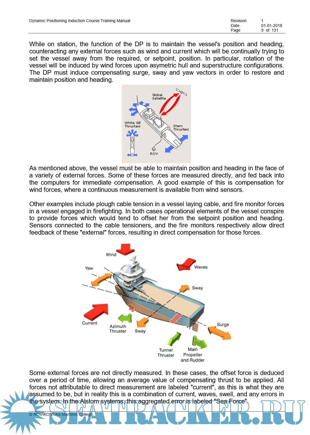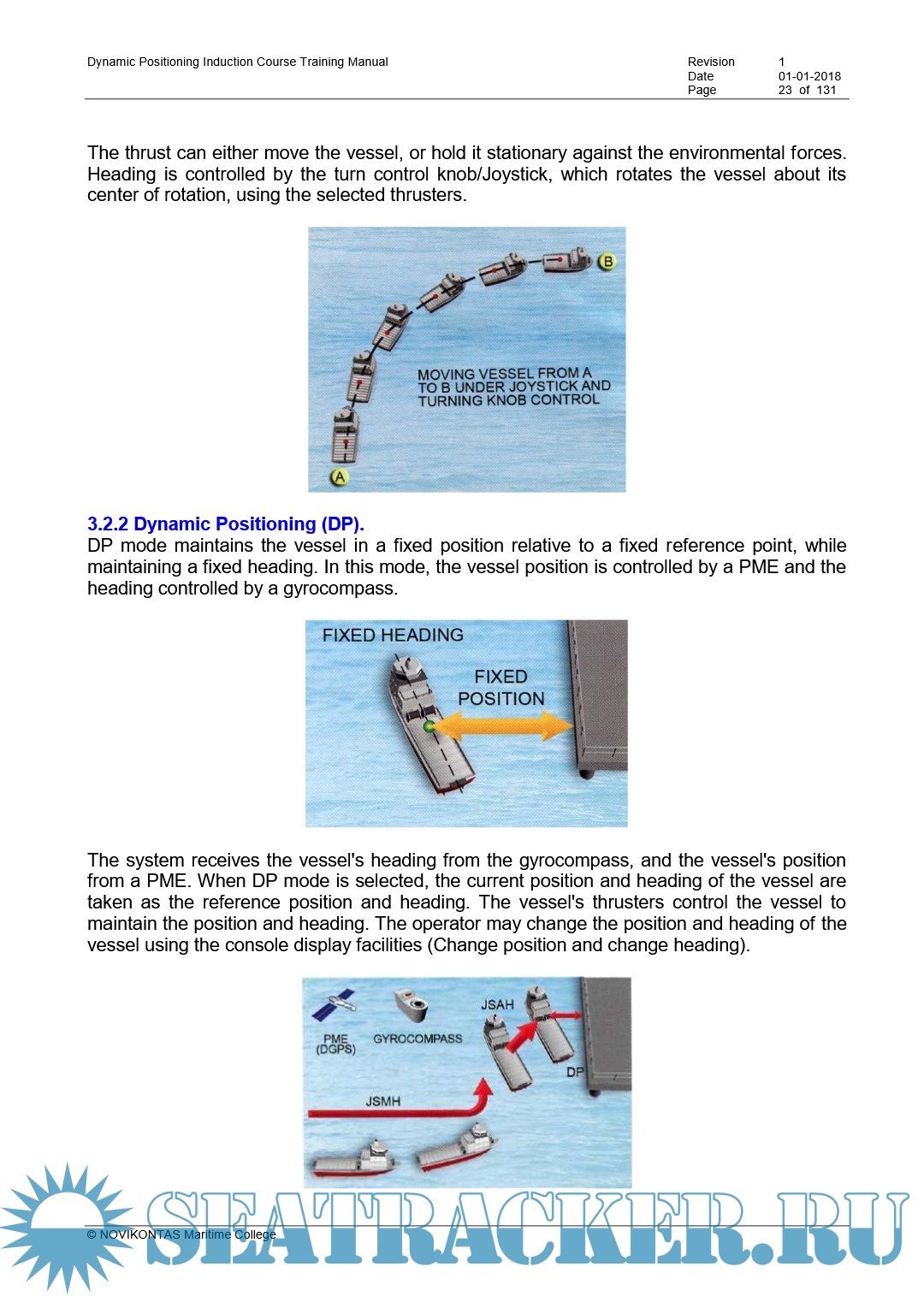 Year: 2018 Language: English Author: Novikontas Maritime College Genre: Training Course, Training manual Format: PDF Quality: eBook Pages count: 132 Description: The Dynamic Positioning (DP) Induction Course will provide an in-depth understanding of the positioning system as it is used to compensate for vessel movement. It will cover vessels’ DP referencing systems, sensors, power plants, thrusters and feedback systems. Those who successfully complete this course should have acquired a knowledge of the principles of Dynamic Positioning, be able to set up a Dynamic Positioning system and have an understanding of the practical operation of associated equipment, including position reference systems. Trainees should be able to recognize and respond to the various alarms, warning and information messages. Trainees should also be able to relate the DP installation to the ship system, e.g. power supply, maneuvering facility, available position reference systems and nature of work. Trainees should also be able to relate DP operations to the existing environmental conditions of wind, sea state, current and vessel movement.