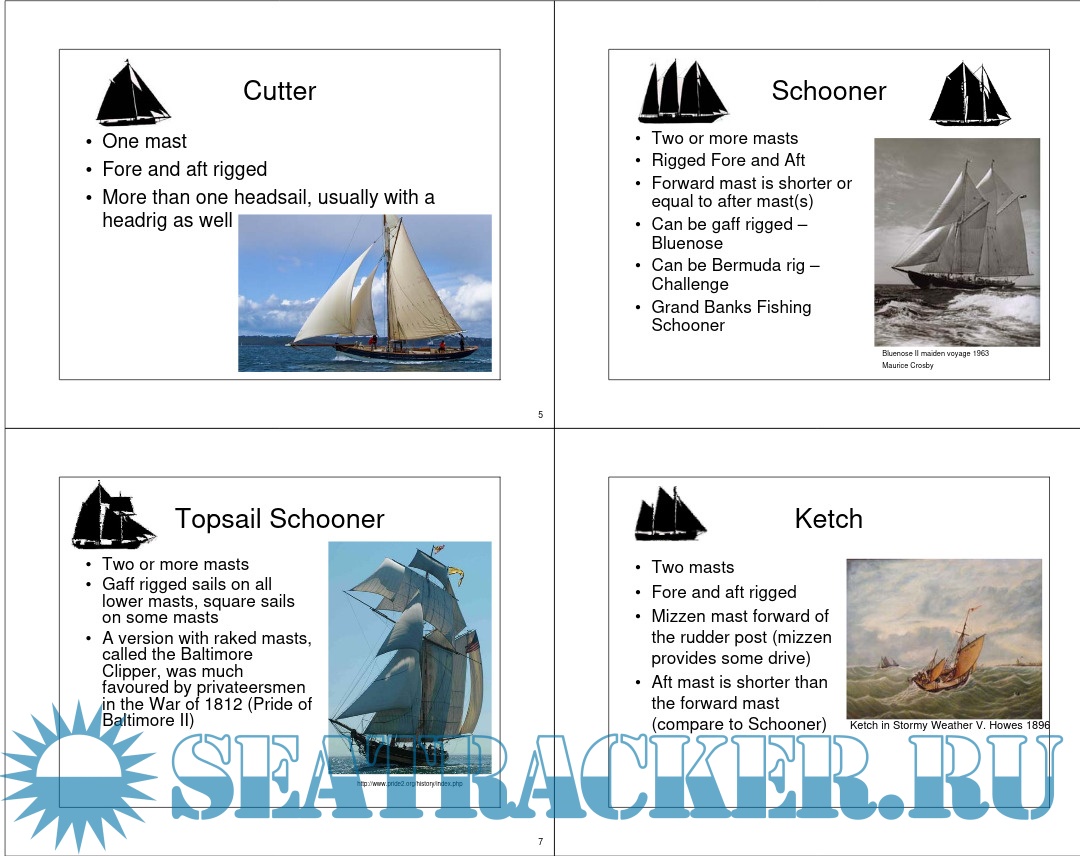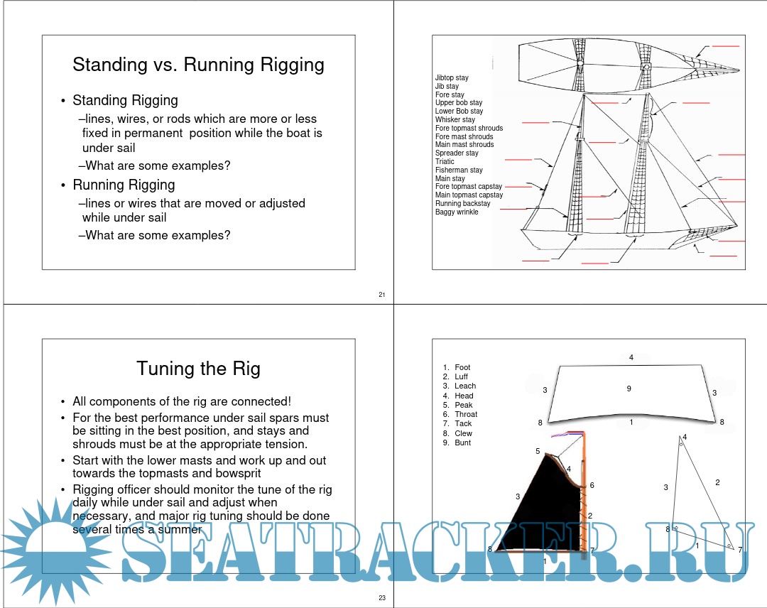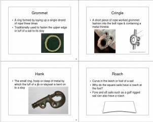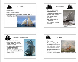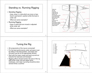 Description: Rigs and Rigging - Types of Rigs - Gaff Rig vs Marconi (Bermuda) Rig - Sloop - Cutter - Schooner - Topsail Schooner - Ketch - Yawl - Barque - Barquentine - Brig - Brigantine - Fully Rigged Ship - Other Rigs - Square vs Fore and Aft Sails - Standing vs. Running Rigging - Tuning the Rig - Sail Theory – How a sail works