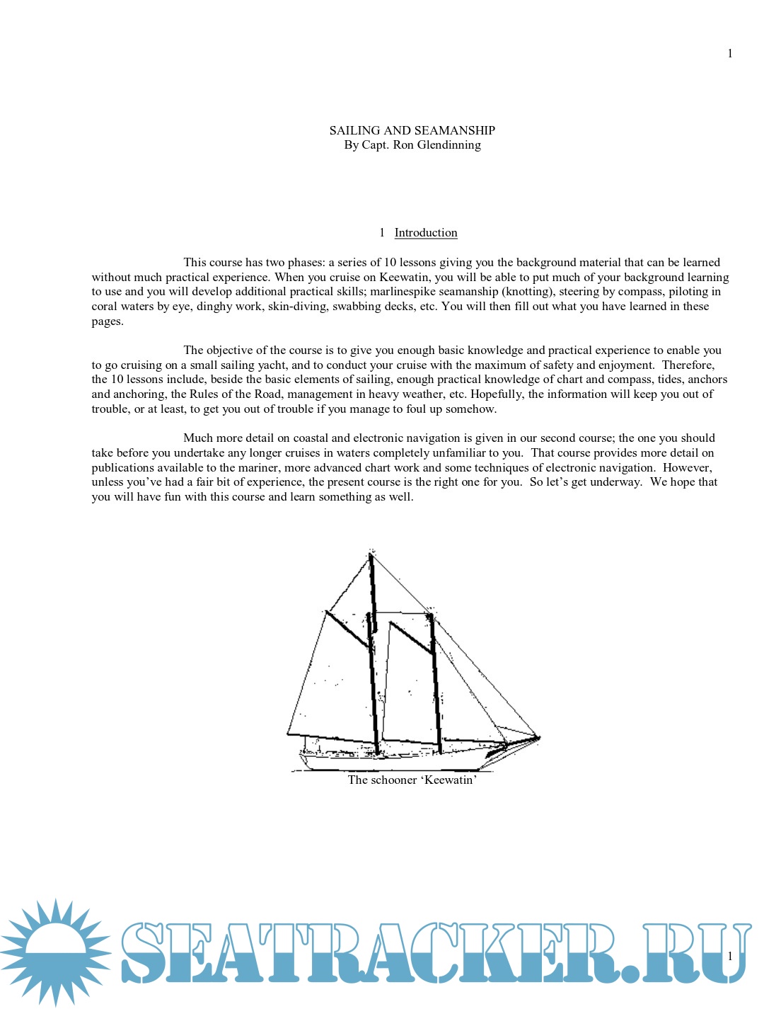 Description: This course has two phases: a series of 10 lessons giving you the background material that can be learned without much practical experience. When you cruise on Keewatin, you will be able to put much of your background learning to use and you will develop additional practical skills; marlinespike seamanship (knotting), steering by compass, piloting in coral waters by eye, dinghy work, skin-diving, swabbing decks, etc. You will then fill out what you have learned in these pages.