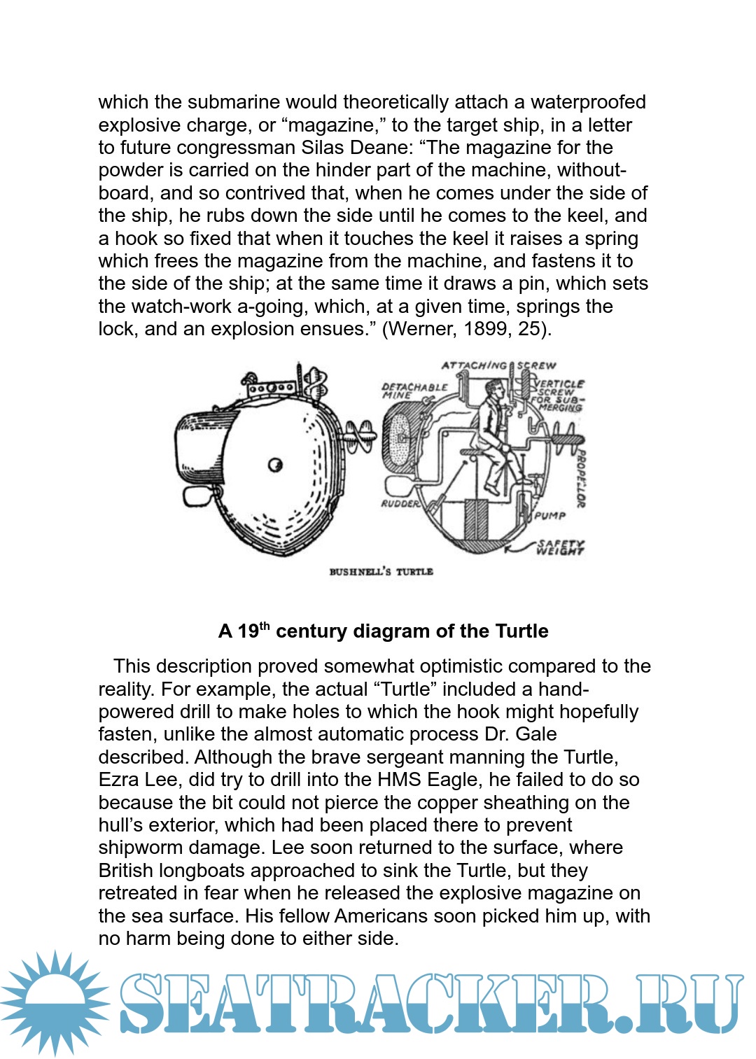Description: Submarine warfare began tentatively during the American Civil War (though the Netherlands and England made small prototypes centuries earlier, and the American sergeant Ezra Lee piloted the one-man “Turtle” vainly against HMS Eagle near New York in 1776). But Robert Whitehead's invention of the torpedo introduced the weapon later used most frequently by submarines, and steady improvements to Whitehead's design led to the military torpedoes deployed against shipping during both World Wars.