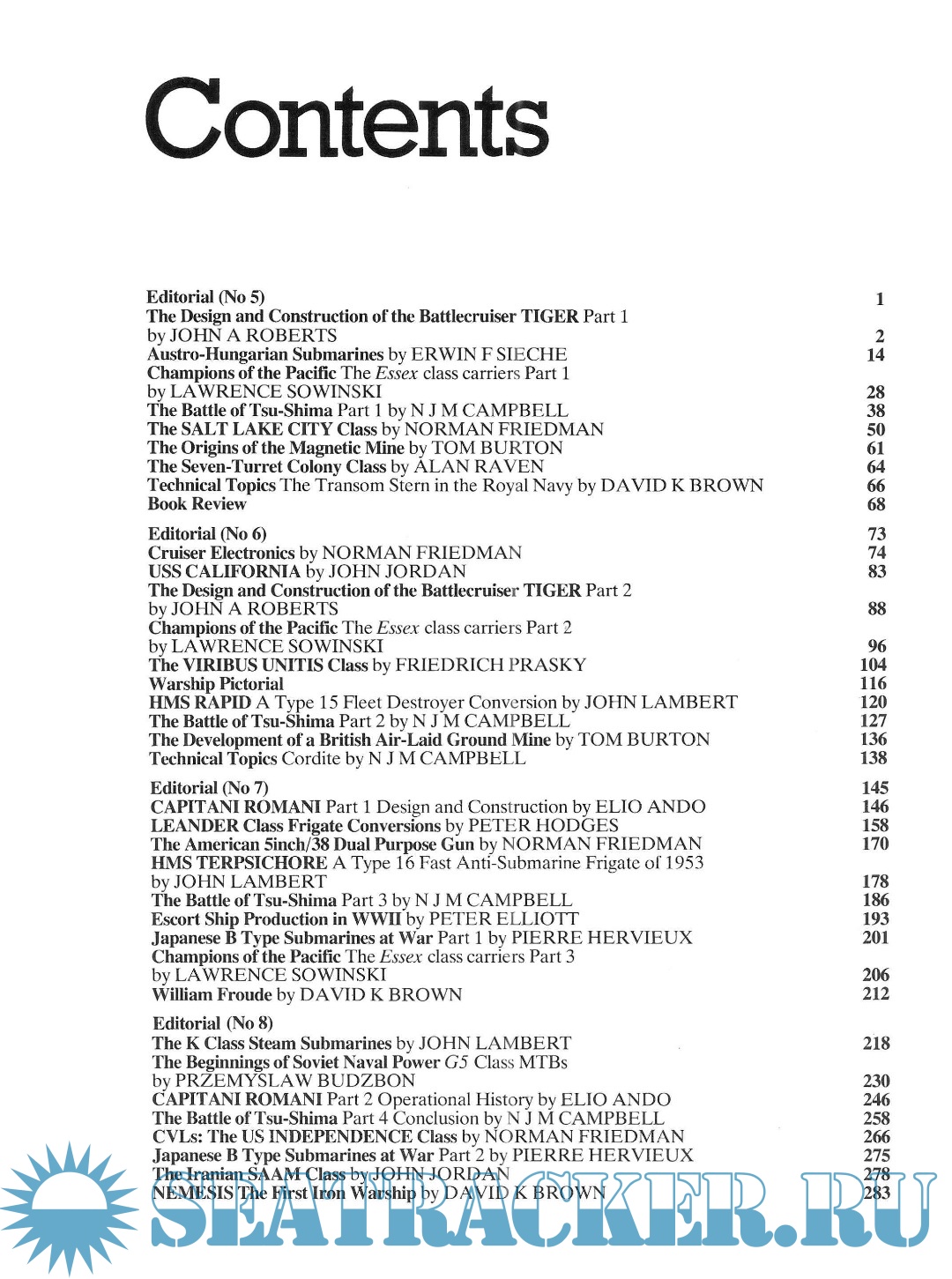 Year: 1978 Language: English Author: Preston A. Genre: Periodical publication Publisher: Conway Maritime Press Format: PDF Quality: eBook Pages count: 294 Description: Issue No 5 The Design and Construction of the Battlecruiser Tiger, by John Roberts Austro-Hungarian Submarines, by Erwin F Sieche Champions of the Pacific: The Essex Class Carriers (Part 1 of 3), by Lawrence Sowinski The Battle of Tsu-Shima, by N J M Campbell The Salt Lake City Class, by Norman Friedman The Origins of the Magnetic Mine, by Tom Burton The Seven-Turret Colony Class, by Alan Raven Technical Topics: The Transom Stern in the Royal Navy, by David K Brown Issue No 6 Cruiser Electronics, by Norman Friedman USS California, by John Jordan The Design and Construction of the Battlecruiser Tiger, by John Roberts Champions of the Pacific: The Essex Class Carriers (Part 2 of 3), by Lawrence Sowinski The Viribus Unitis Class, by Friedrich Prasky Warship Pictorial HMS Rapid: A Type 15 Fleet Destroyer Conversion, by John Lambert The Battle of Tsu-Shima, by N J M Campbell The Development of a British Air-Laid Ground Mine, by Tom Burton Technical Topics: Cordite, by N J M Campbell Issue No 7 Capitani Romani: Design and Construction (Part 1 of 2), by Elio Ando Leander Class Frigate Conversions, by Peter Hodges The American 5inch/38 Dual Purpose Gun, by Norman Friedman HMS Terpsichore: A Type 16 Fast Anti-Submarine Frigate of 1953, by John Lambert The Battle of Tsu-Shima, by N J M Campbell Escort Ship Production in WWII, by Peter Elliott Japanese B Type Submarines at War, by Pierre Hervieux Champions of the Pacific: The Essex Class Carriers (Part 3 of 3), by Lawrence Sowinski William Froude, by David K Brown