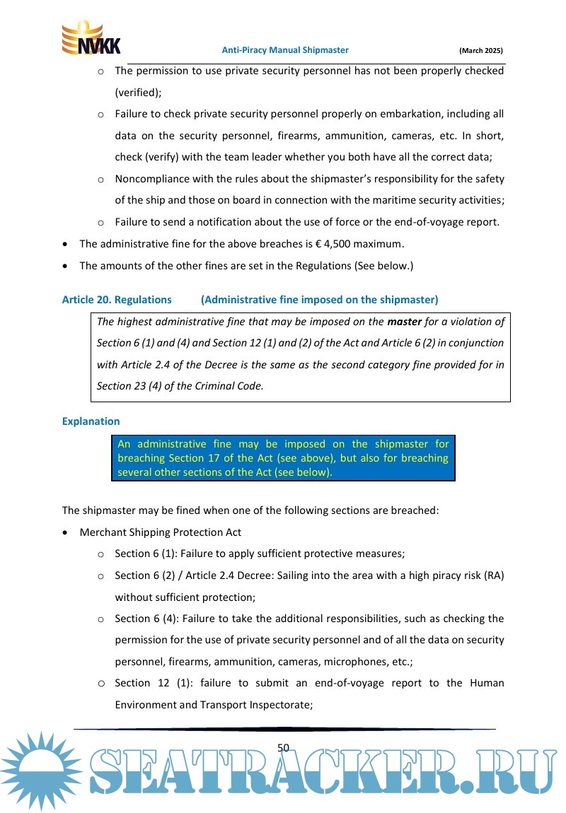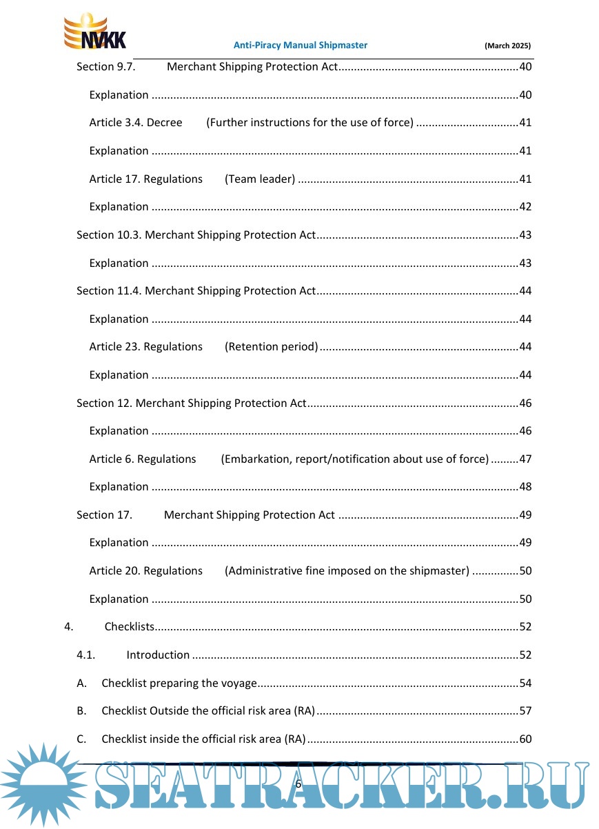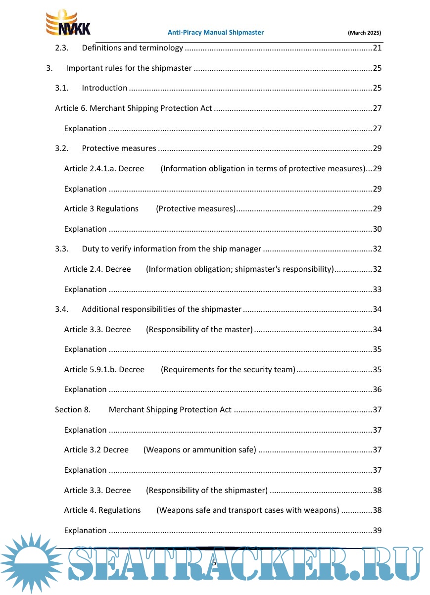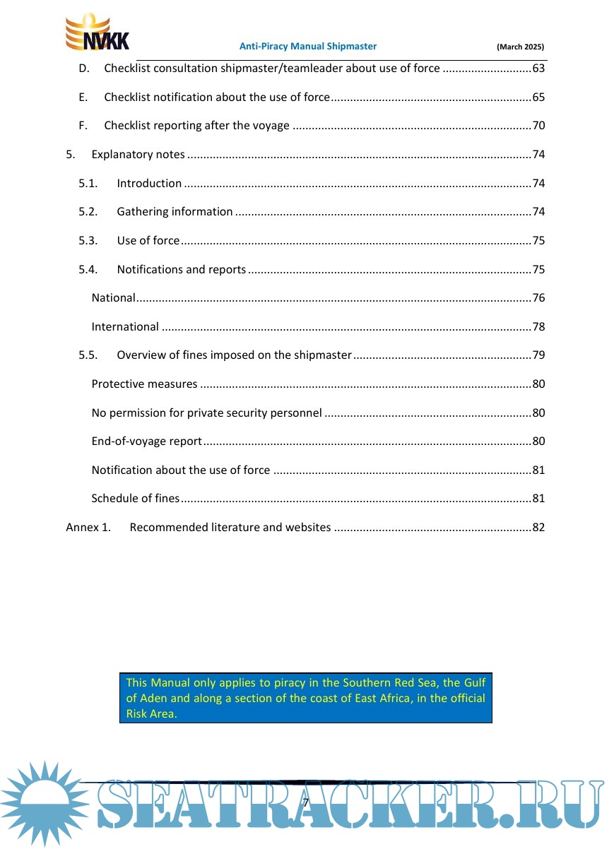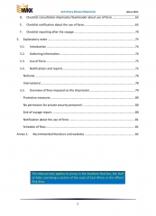 The core of this Manual is formed by a number of uniquely numbered checklists to make sure the shipmaster does not forget anything. Furthermore, a number of important subjects are discussed, such as the use of force, notifications and reports, fines, etc.