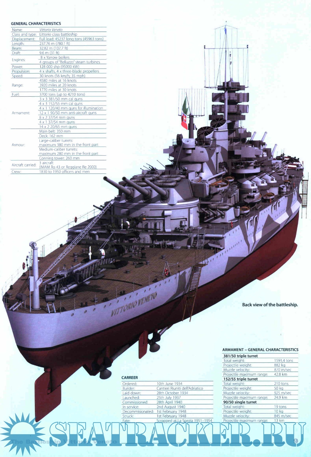Description: Battleship Vittorio Veneto was one of three Italian Littorio class battleships operating in the Second World War. She was one of the most modern and powerful battleships of her times. She was designed by General Umberto Pugliese and engineer Francesco Mazzullo., and she was the first battleship to exceed the limit of 35,000 tons of displacement imposed in the Washington Naval Treaty. The keel of the Vittorio Veneto battleship was laid down by the Italian shipbuilder Cantieri Riuniti dell’Adriatico in Trieste on 28th October 1934. She was launched in July 1937 and began her service in the Italian Fleet (Regia Marina) by August 1940. She was named in honor of the Italian victory at Vittorio Veneto in the First World War and she had three sister ships: Littorio, Roma, and Impero (the last one was never completed). She was armed with a main battery of nine 38- millimeter guns and three triple turrets. She was able to reach a speed of 30 knots (56 Km/h).