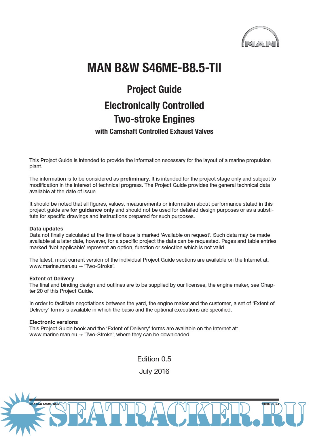 Description: This Project Guide provides preliminary technical information for planning and designing a marine propulsion system based on the MAN B&W S46ME-B8.5-TII electronically controlled two-stroke engine with camshaft-controlled exhaust valves.