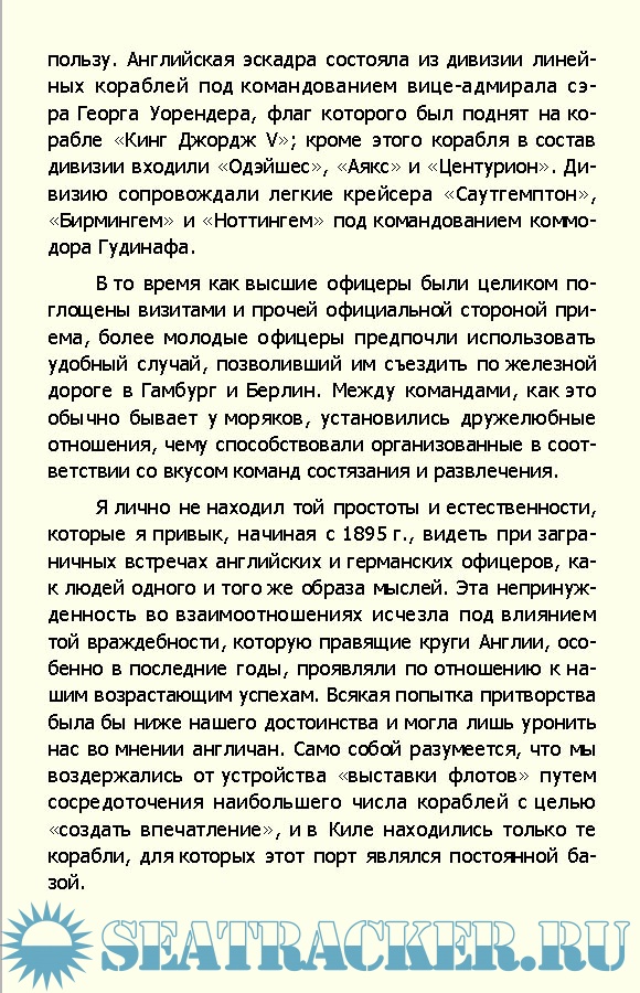 Описание: Книга германского адмирала Рейнхарда Шеера (1863—1928) рассказывает об операциях военно-морских сил Германии в Первую мировую войну. С начала войны Шеер командовал соединением линейных кораблей, а в январе 1916 года был назначен командующим Флотом открытого моря. В мае того же года, в Ютландском сражении — крупнейшей морской битве Первой мировой войны между немецким и британским флотами, командовал германскими силами. Позже Шеер становится сторонником стратегии неограниченной подводной войны. Написанная вскоре после окончания войны, книга отражает немецкую точку зрения на ход и итоги морского противостояния Британии и Германии.
