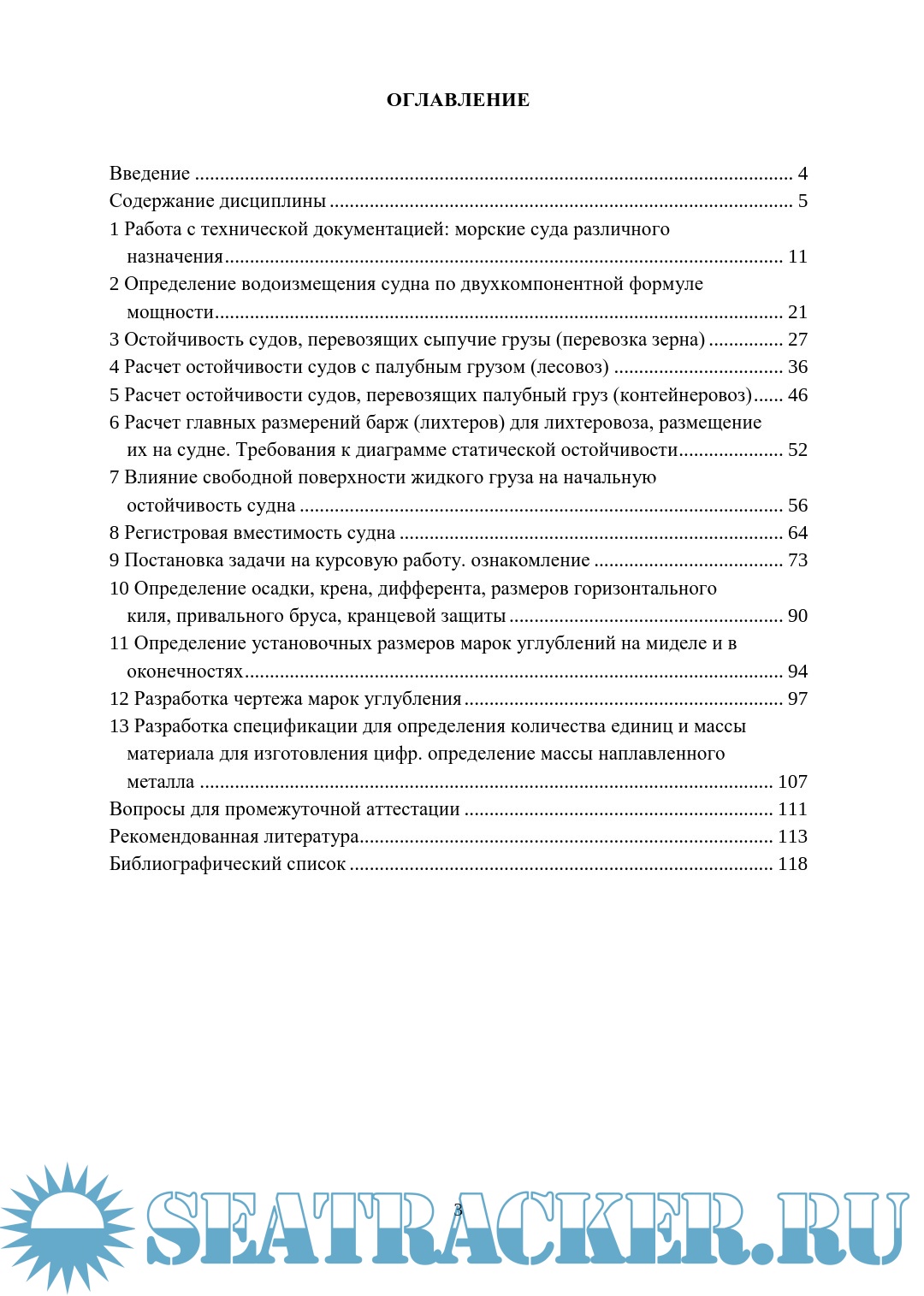 Введение. Содержание дисциплины. Работа с технической документацией: морские суда различного назначения. Определение водоизмещения судна по двухкомпонентной формуле мощности. Остойчивость судов, перевозящих сыпучие грузы (перевозка зерна). Расчет остойчивости судов с палубным грузом (лесовоз). Расчет остойчивости судов, перевозящих палубный груз (контейнеровоз). Расчет главных размерений барж (лихтеров) для лихтеровоза, размещение их на судне. Требования к диаграмме статической остойчивости. Влияние свободной поверхности жидкого груза на начальную остойчивость судна. Регистровая вместимость судна. Постановка задачи на курсовую работу. ознакомление. Определение осадки, крена, дифферента, размеров горизонтального киля, привального бруса, кранцевой защиты. Определение установочных размеров марок углублений на миделе и в оконечностях. Разработка чертежа марок углубления. Разработка спецификации для определения количества единиц и массы материала для изготовления цифр. определение массы наплавленного металла. Вопросы для промежуточной аттестации. Рекомендованная литература. Библиографический список.