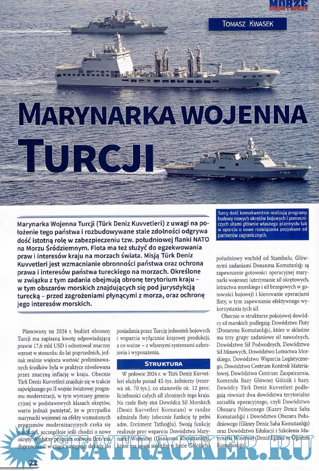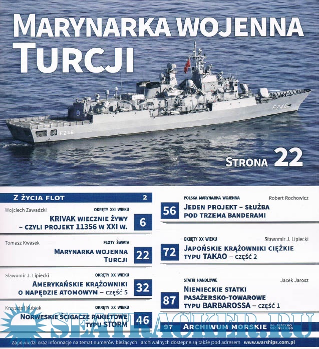 Описание: Польский морской журнал. Издается с 1996 года, первоначально как ежеквартальный. С 1999 года издается раз в два месяца, а с 2007 года-как ежемесячный. Первоначально назывался Morza Statki i Okrety, в 2006 году переименован в Morze Statki i Okrety. С 2004 года полностью цветной (ранее только вставки). В 2008 году стали издаваться специальные выпуски, первоначально нерегулярные. С 2014 года выпускается как обычное издание и специальное издание, с непрерывной нумерацией.